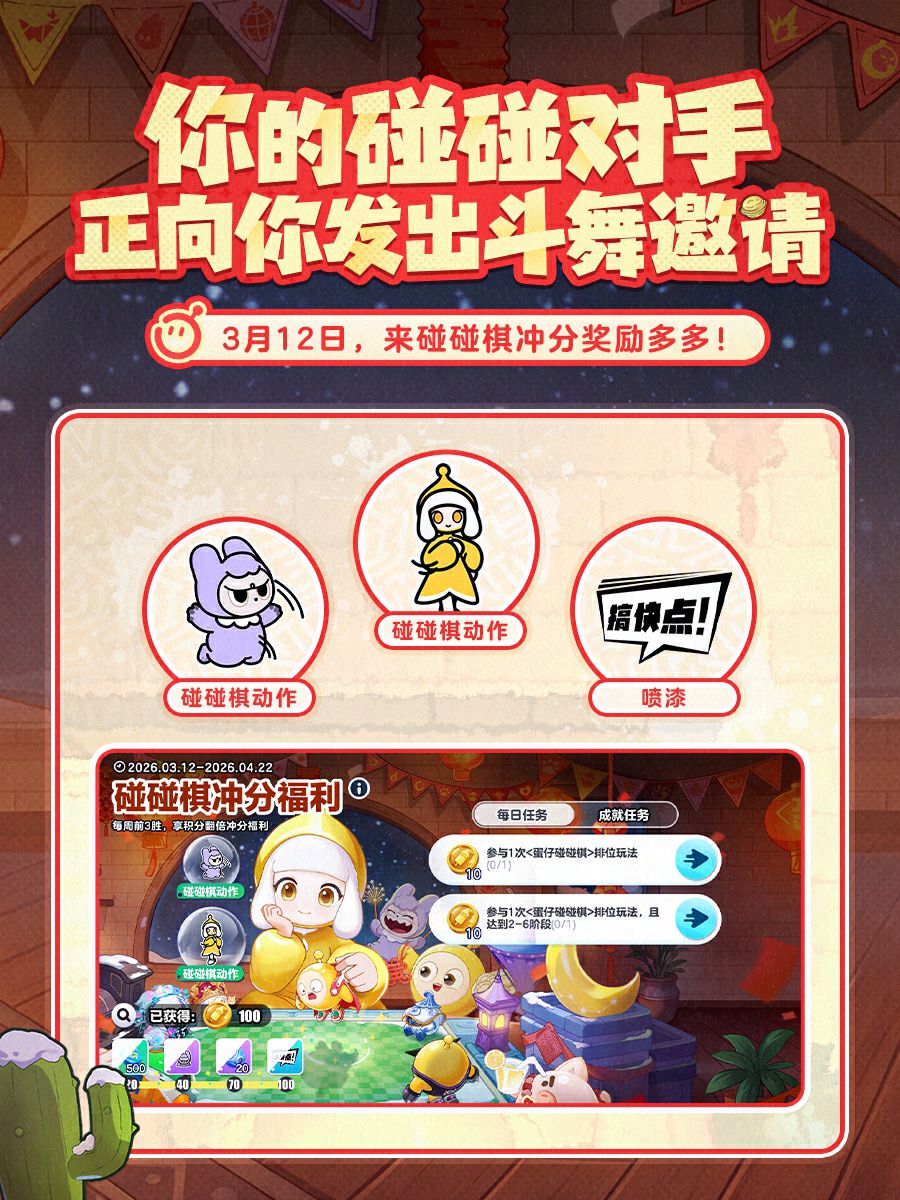 3月12日起,参与蛋仔碰碰棋冲分活动,领毛哆哆表情「红包拿来」及道具「搞快点喷漆」!达到指定段位,免费得泡芙、毛哆哆专属社交动作! 每周前3胜,还可享积分翻倍冲分福利!一边冲分一边蹦迪,碰碰棋最靓的仔非你莫属啦~ —— 碰碰棋新赛季火热筹备中!快抓住赛季末的尾巴,猛猛上分再创新巅峰吧~ #蛋仔碰碰棋 #蛋仔全明星大乱碰 #蛋仔派对