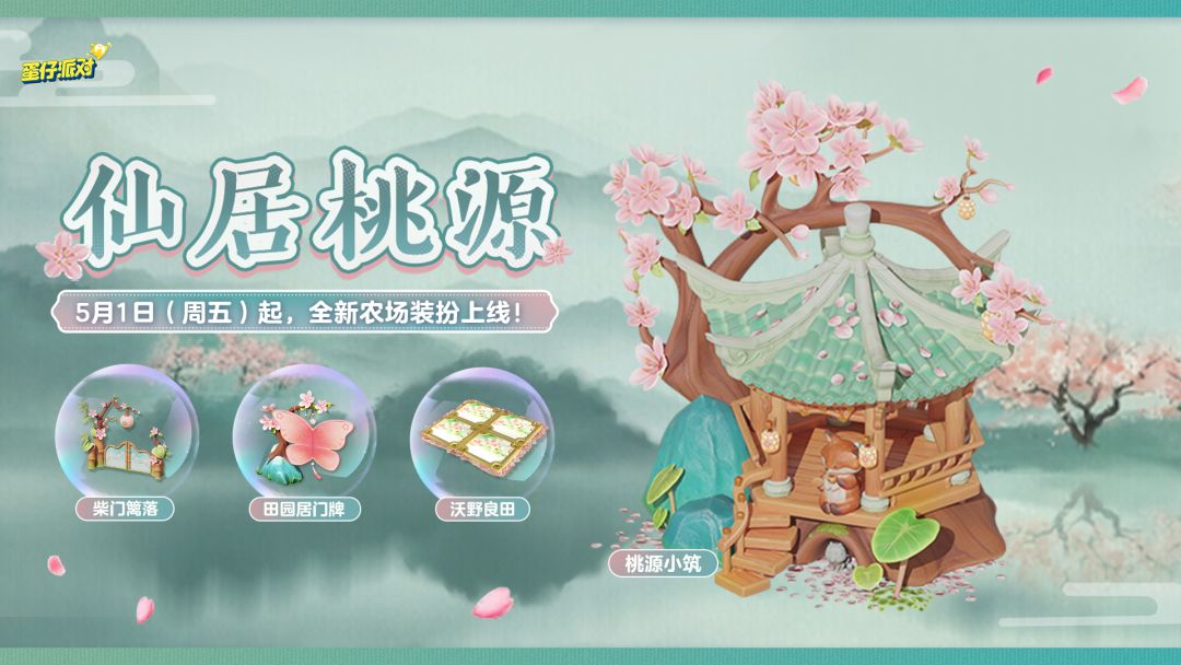 春风十里,桃花满园——这确定是农场?[表情_期待] 水墨远山云雾缭绕,飞檐翘角的中式凉亭坐落田间,落英缤纷铺满山坡,还有一只小狐狸在凉亭下悠然品茶。春耕桃花下,梦回诗画田园。 5月1日(周五),全新国风田园主题<仙居桃源套装>上线!参与农场装扮祈愿,即有机会获得<桃源小筑>、<沃野良田>、<柴门篱落>、<田园居门牌>,集齐套装还可加购天空盒<水墨天青>。 种地?[表情_酷]不,这叫归隐。 阿