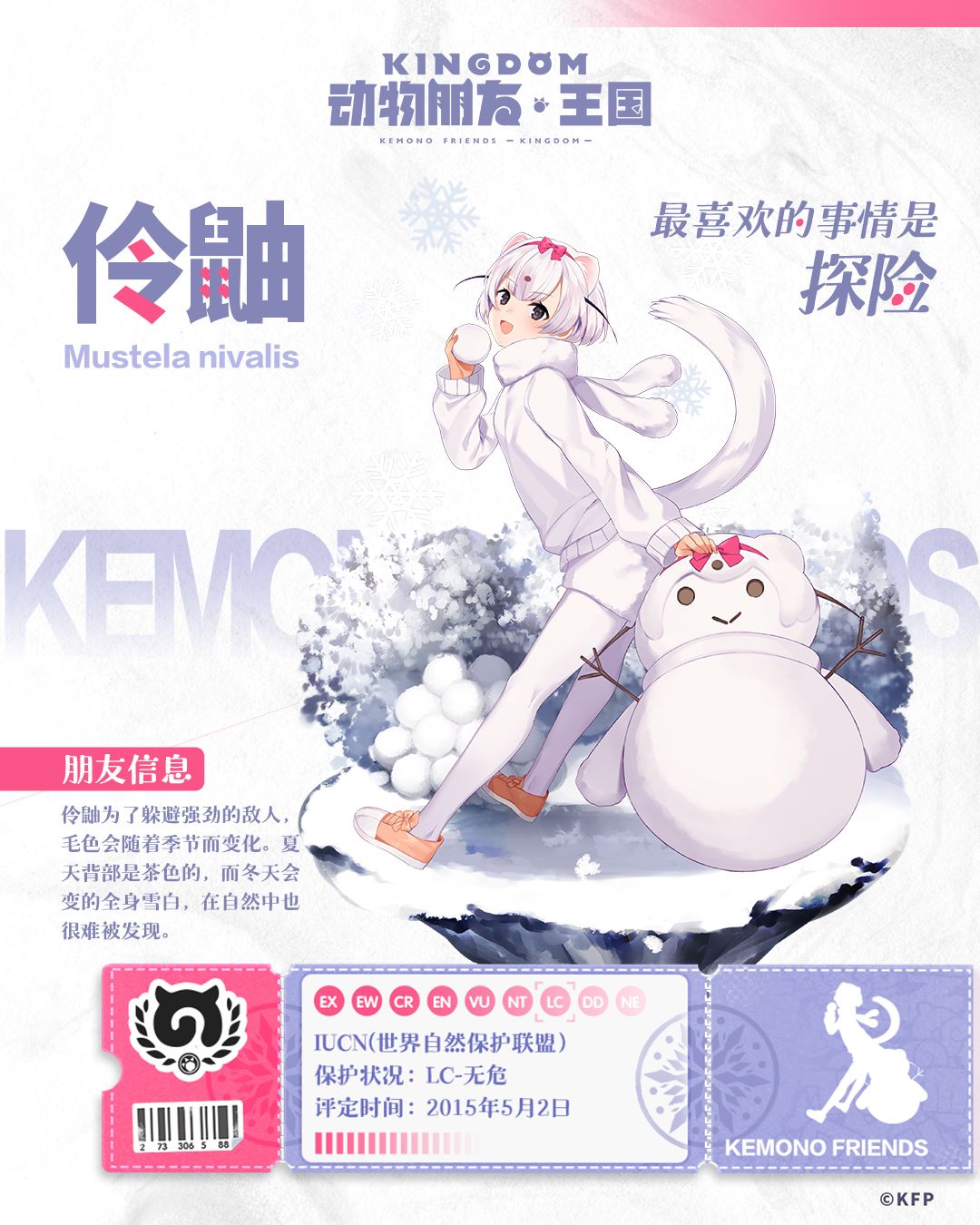 “最喜欢的事情 是探险!” 住在王国中草原村庄的伶鼬,动作十分机敏。 虽然个头小,但食量超大!这可是在王国出了名的。 从白天到黑夜她都超有元气的到处玩耍,在肚子饿的时候又会吵着要吃王国馒头。 伶鼬和鼷鹿虽然个性完全不同,但相处的很契合,常常一起去各处探险~ 「冷知识」 伶鼬为了躲避强劲的敌人,毛色会随着季节而变化:夏天呢,背部是茶色的,而冬天则会变的全身雪白,在自然中也很难被发现。 ———————