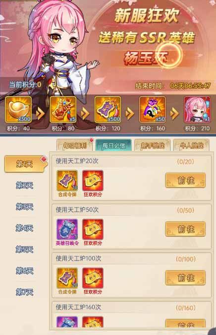 新服之中,七日活动里能拿到大量珍惜材料,是各位小主们提升战力的好途径噢!接下来,小貂蝉给各位小主们详细解读,活动内容吧~ 首先,我们看下新服七日活动,在这个活动中,完成每日任务,能领取对应的积分,达到积分后即可领取积分奖励,最后一个则是赠送杨玉环,杨玉环在众多英雄里面,是属于SSR的一张卡牌,她属于大汉阵型,战士,是个暴力输出型武将,超高伤害的怒气技能,天赋加高爆击,还能增加额外伤害,击杀目标更
