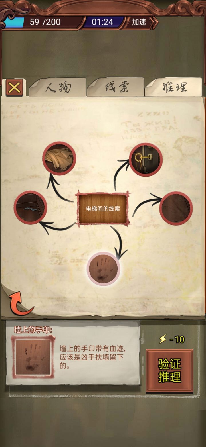 电梯间线索如下所示:程峰的指证及消失的尸体推理图(简称推理图(1)):雷世荣办公室及尸体线索:推理图(2):手术室线索:麻醉科线索及推理图(3):墙上的黑色挎包;桌上的金笔和病历(应该是病历);旁边柜子中有两份类似档案的线索(啊----忘截屏了,只能凭想象这么讲了囧rz )护士值班室线索:护士长办公室线索:推理图(4):迈克尔房间线索及推理图(5):同样,主页面忘截图了,墙