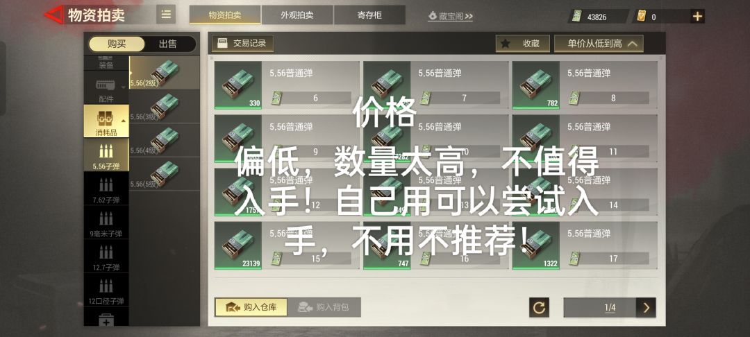 子弹属于消耗品,也是获得速度最快的物品!尽量不要碰,很容易出现问题! 绿色价格低,自己用还可以!倒卖就算了,越囤越多!每次出来的时候我身上至少有的时候三百发子弹,卖的人多了价格就不值钱了。不卖还觉得亏了,我相信有些人相信会回暖的。但子弹纯纯仓库,多了没地方放! 蓝色子弹市面流通少,预估一部分人在仓库里囤着。就怕一不小心就会爆雷了,一夜之间子弹遍地都是! 紫色子弹,稀少伤害高!适合土豪玩家玩,市场流