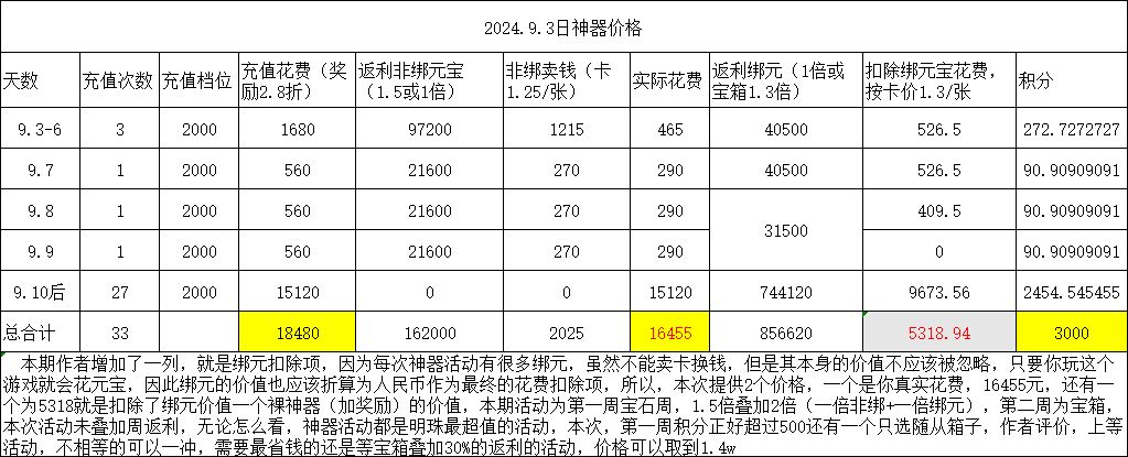 如题,本次神器活动第一周1.5叠加3天3倍,而且按我那种方式冲下俩第一周积分超过500,还送一个自选随从碎片箱子,性价比较高 最终花费去到1.6w,扣除绑元价值,一把神器加奖励的价格来到了5300,还不错。 本次神器活动评价 ,上等!![表情_思考] 需要的冲冲冲