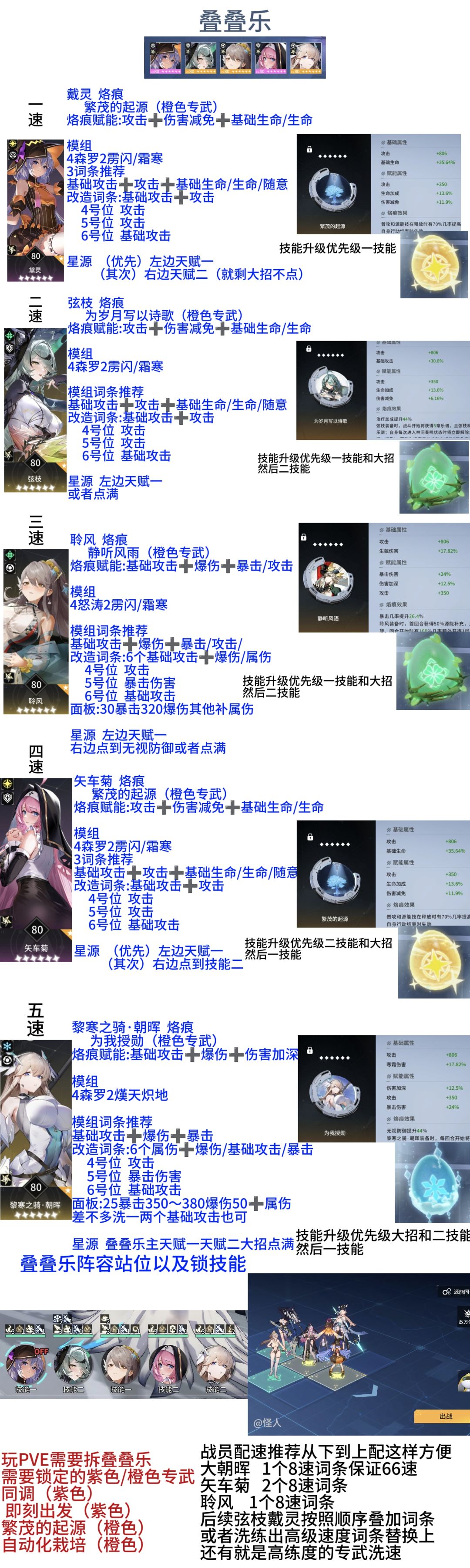 #锚点降临 个人评价: PVP强度EX(满命)和PVE强度T1 技能优先升级推荐 源能爆发>技能1>技能2=普攻 PVP模组推荐 4雳闪穹鸣+2怒涛之势或者4森罗侵浸+2怒涛之势 IV(4)号位模组主属性推荐:速度 V(5)号位模组主属性推荐:暴击率 VI(6)号位模组主词条推荐:基础攻击 模组副词条推荐: 速度>=暴击率>暴击伤害>基础攻击 (注:模组不必强求极品,456号位有两条能用即