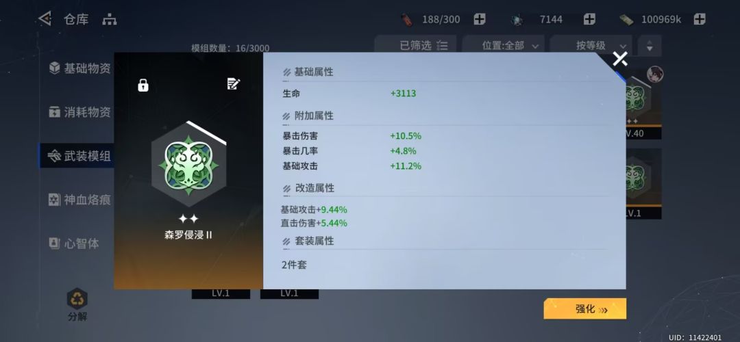 一、角色等级 一般推荐将你需要的角色练到4突破60级,60到80的过程性价比较低,开荒期间不推荐拉满,同时60级解锁全部模组槽位,模组是这个游戏角色养成之中的重中之重。 二、模组刷取 无脑推荐森罗和生命,开荒阶段这两个的收益非常大,参考词条见图。 这里给一个简易口诀:加攻辅助双基础,生命防御前排用,暴击暴伤找C位,速度按需自己配。 双基础指:基础攻击和基础生命。 关于防御:一般只留基础防