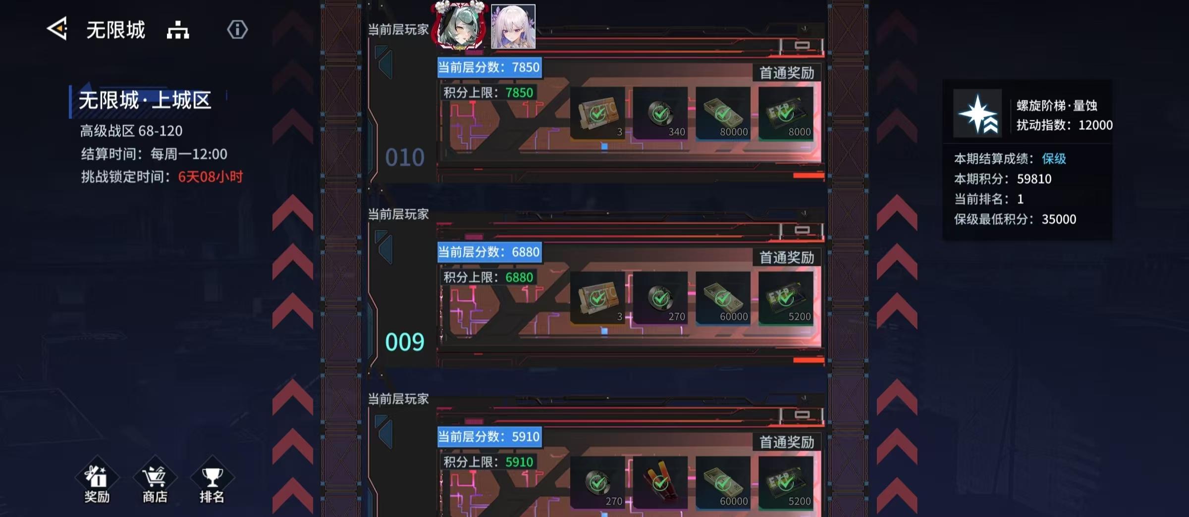 非最优解,仅供参考,仅适用官服的高级战区上城区仍然建议选用叠叠乐阵容为基础,黛灵,矢车菊,弦枝/艾可,聆风。 新版无限城主C最强的是白蔷薇、红叶,不过白蔷薇日常被BAN,还是红叶用的多。本期关卡是量蚀BUFF,所以难度略有降低。无限城必须上肉的关卡,推荐大家给肉盾带四怒涛,烙痕带同调。限量蚀的关卡,优先带弦枝/艾可,瞳光霜琼候补。无限城带有一定随机性,有些小区是5800%血量,非常阴间