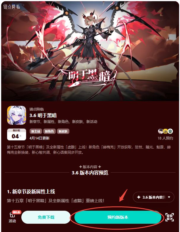 方式2:在TapTap中搜索“锚点降临”,点击下方的图片即可进入“预约新版本”界面;