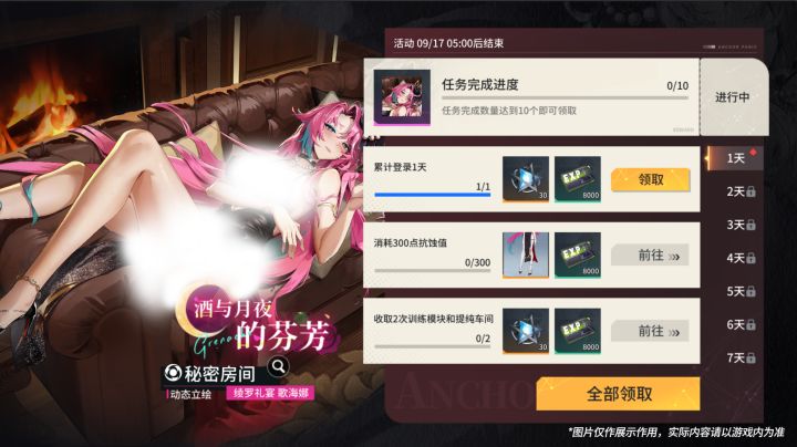 #锚点降临 #锚点降临二周年 《锚点降临》二周年庆典倒计时开启!链尉官,就知道你准会把这日子记在心上~要是时间能停在和你并肩的每一刻就好啦… 不过没关系,未来还有好多个周年要一起过!【酒与月夜的芬芳】活动时间:8月6日-9月17日(即3.0版本同步开放)活动规则:3.0 版本更新后,每日将解锁新的活动任务。链尉官只需在活动期间完成指定数量的任务,就能免费领取歌海娜全新换装【秘密房间】及