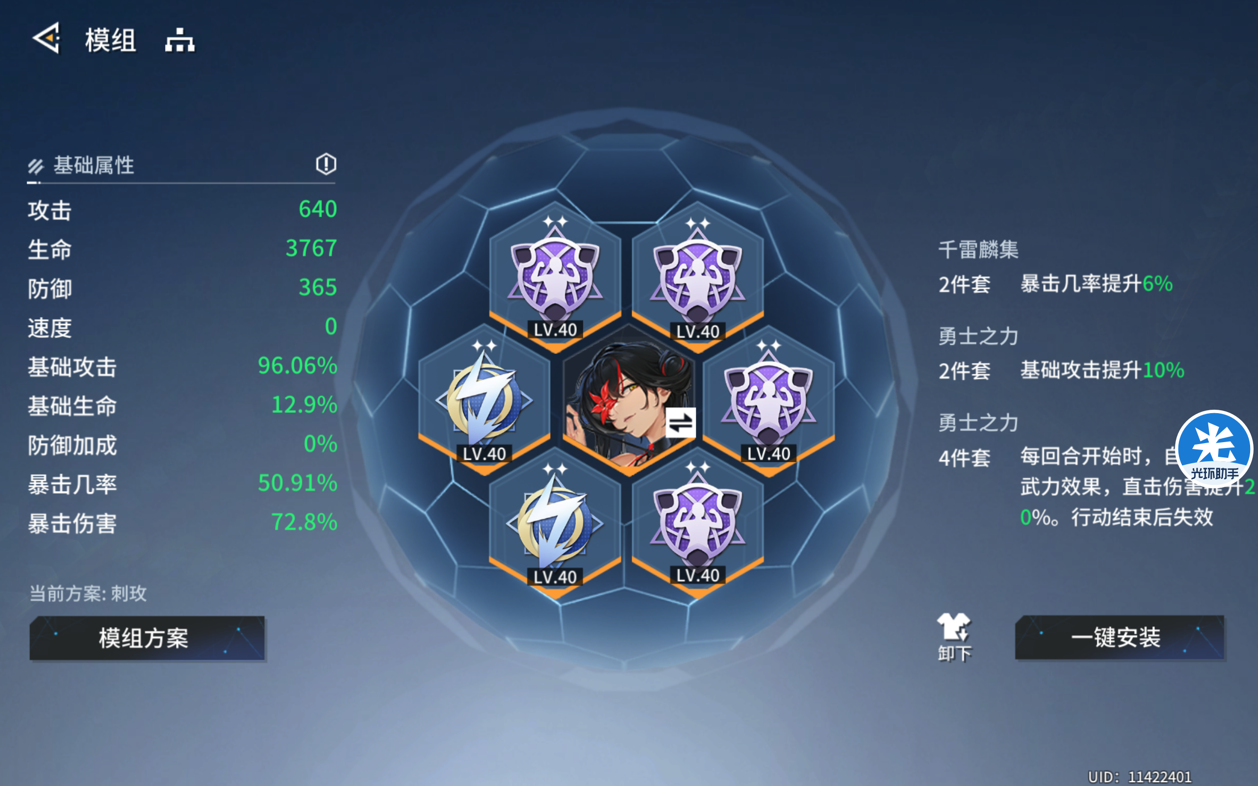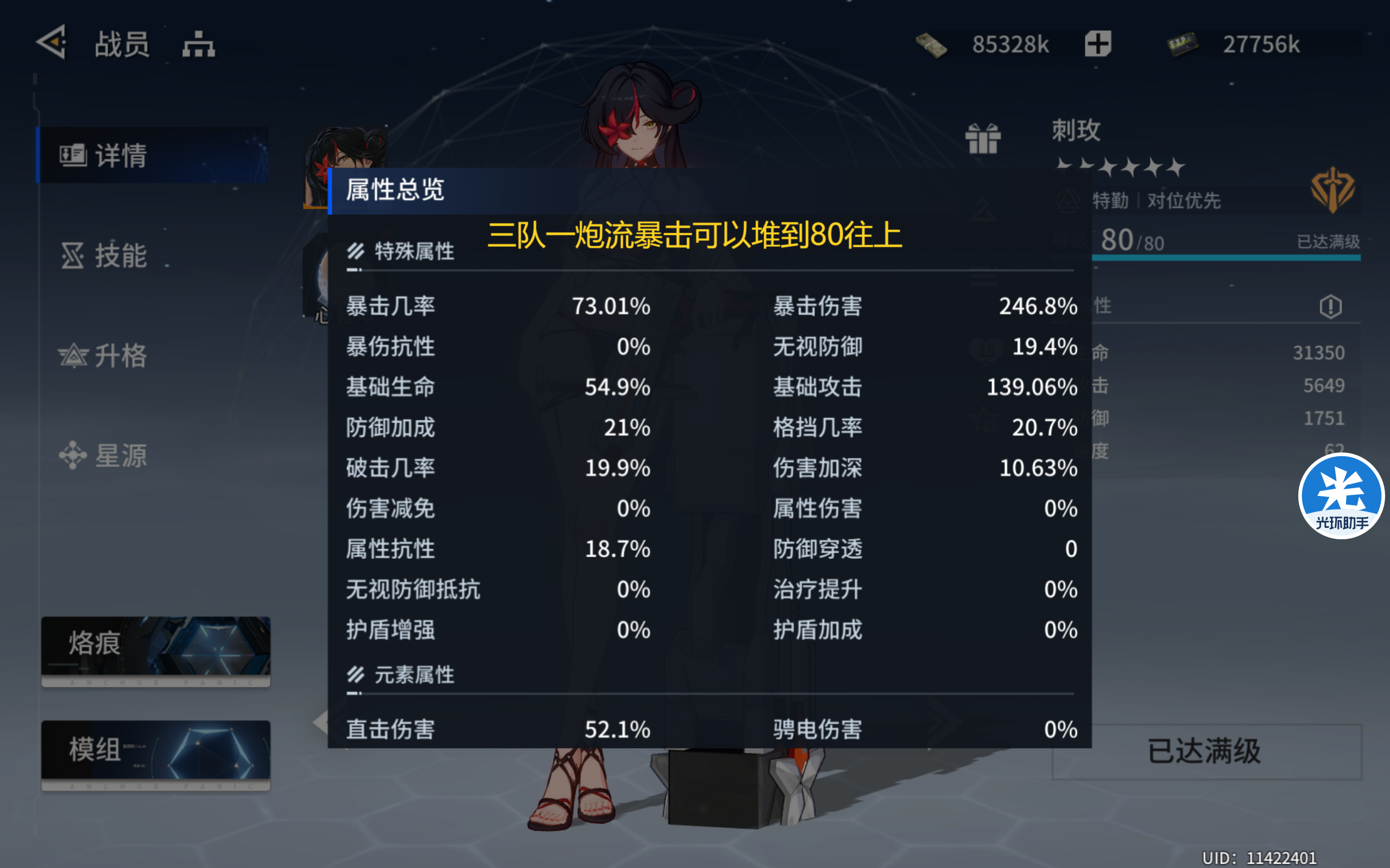 模组推荐:4森罗+2件10%攻击套,鉴于其专武给不少爆伤,且考虑到红叶和燕鸥绑定。那么模组副词条选择上我们可以选择性不带1-2条爆伤,当然最完美的是用双爆大公鸡。星源推荐:有能力的把双天赋点掉,如果不考虑天赋把下面一排基础星源点掉了伤害也不俗。心智体推荐:火金蛋慎重考虑 铁打的辅助流水的c四号位主属性带攻击 五号位主属性带暴击专武洗爆伤、攻击、伤害加深改造方面个人推荐洗3-4个暴击,6个