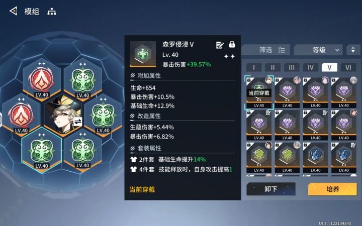 模组推荐:4森罗+2件10%攻击套,鉴于其专武给不少爆伤,且考虑到红叶和燕鸥绑定。那么模组副词条选择上我们可以选择性不带1-2条爆伤,当然最完美的是用双爆大公鸡。星源推荐:有能力的把双天赋点掉,如果不考虑天赋把下面一排基础星源点掉了伤害也不俗。心智体推荐:火金蛋慎重考虑 铁打的辅助流水的c四号位主属性带攻击 五号位主属性带暴击专武洗爆伤、攻击、伤害加深改造方面个人推荐洗3-4个暴击,6个
