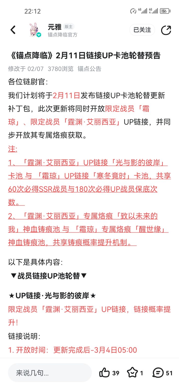 锚点降临这款游戏开服至今只有三个限定角色,分别是:T0辅助-霜琼,T0输出-霆渊艾丽西亚,T0肉盾:云篆。这三个限定角色的强度想必各位老登早已深有体会,无需赘述。好消息:霜琼和霆渊返场了,新入坑的朋友和小登们终于可以拥有了。坏消息:云篆刚刚结束,钻石可能已经花光,必须重新攒资源了。言归正传。霜琼只抽0+0就可以,也就是一个本体,一个专武。霆渊最好能抽到0+6,也就是一个本体,七个专武。