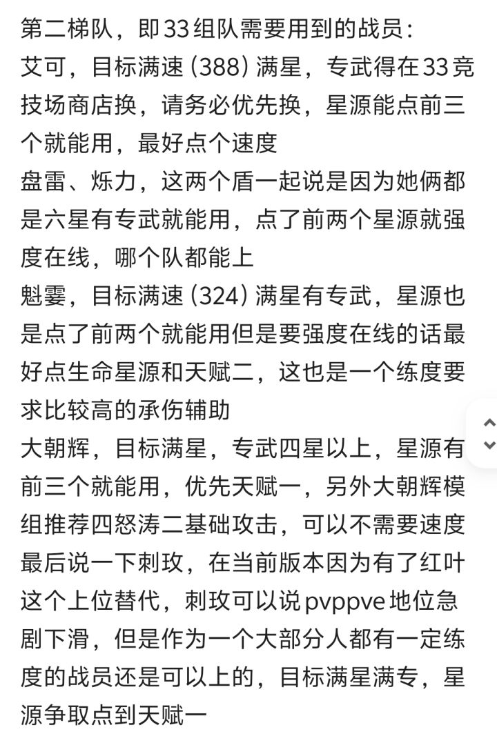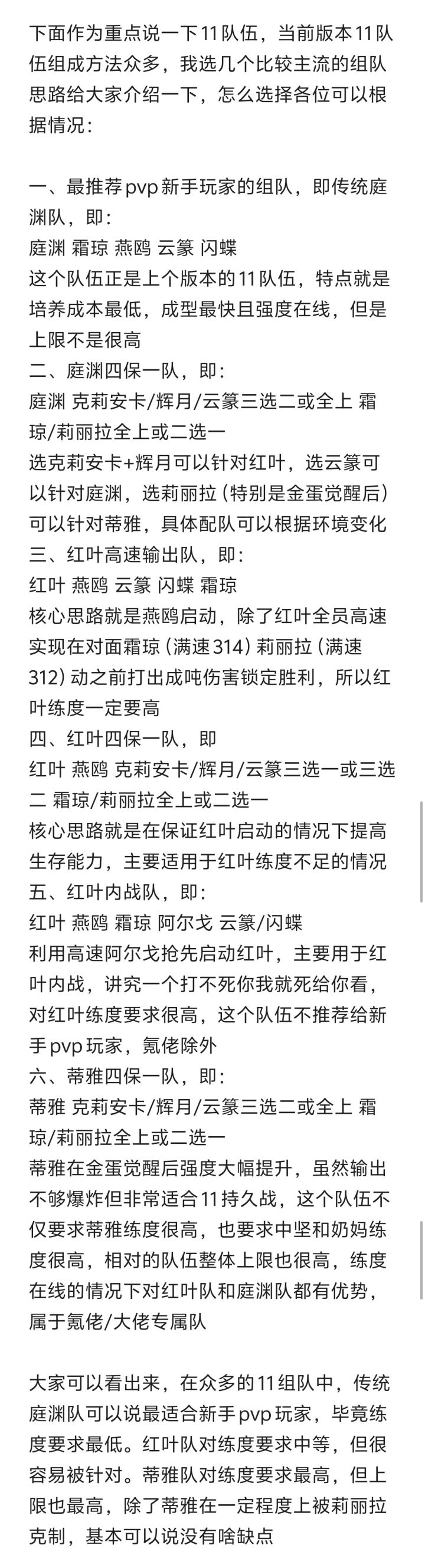2.7版本攻略这么晚主要是因为红叶一直调整,而且我想等pvp环境再稳定一点。目前来看,这个版本可以说是牢锚有史以来pvp队伍最丰富的一次。和以前一样,常规演习称为11,综合对抗赛称为33,方便大家区分。再说一遍,本文针对那些人物基本齐全,有一定练度,想打pvp又没有什么思路的玩家,纯萌新如果对pvp感兴趣可以参考战员培养攻略,大佬如果有兴趣也特别欢迎给我提意见。本次更新增加了蒂雅和言的心智体,
