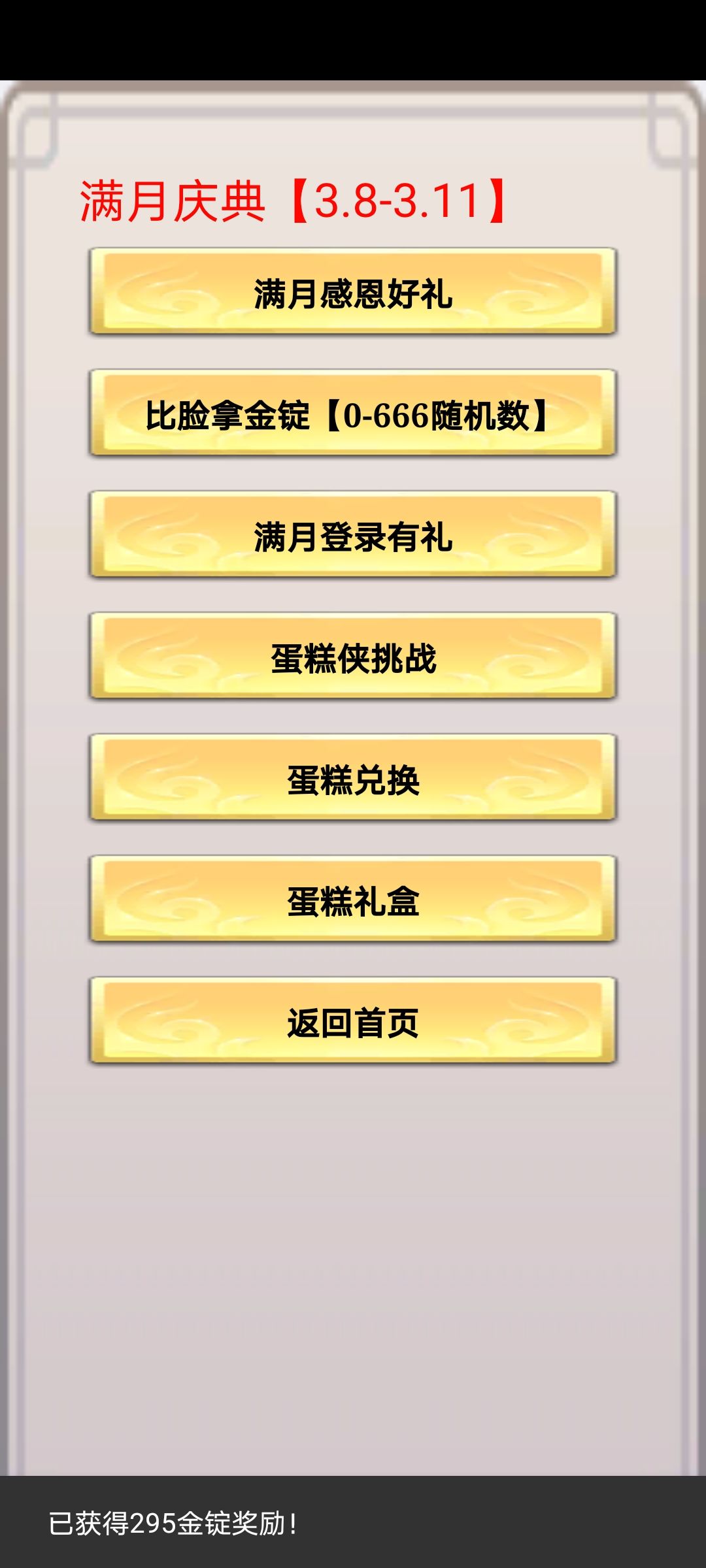 发送满月庆典获取金锭的截图,如下 评论区中获得最高金锭的玩家将获得欧皇奖励【600金锭】随机抽取3位玩家送出【300金锭】的奖励