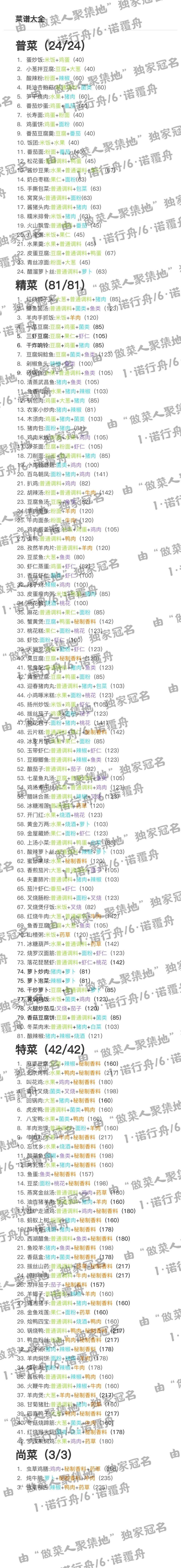 【特】麻婆豆腐:豆腐+辣椒+秘制调料北京烤鸭:水果+鸭+秘制调料叫花鸡:水果+鸡+秘制调料蜜汁叉烧:菌类+叉烧+秘制调料回锅肉:大葱+猪肉+秘制调料虎皮鸭:菌类+鸭+普通调料八宝鸭:水果+菌类+鸭羊肉泡馍:面粉+羊肉+普通调料牛肉丸:大葱+牛肉+秘制调料忘忧乡:水果+烧酒+秘制调料酸菜鱼:精致鱼肉+辣椒+秘制调料烤乳猪:水果+猪肉+秘制调料鱼蛋:精致鱼肉+秘制调料豆浆:面粉+桃花+秘制调料燕窝鸡丝汤:鸡+药草+普通调料油炸猪羊肉:猪肉+羊肉+普通调料挂炉走油鸡:鸡+普通调料+秘制调料蚂蚁上树:粉面+猪肉+秘制调料醉排骨:猪肉+烧酒+秘制调料西湖醋鱼:精致鱼肉+普通调料+秘制调料鱼咬羊:猪肉+精致鱼肉+秘制调料香菇盒:猪肉+菌类+秘制调料凉拌茄子:茄子+秘制调料羊蝎子:普通调料+辣椒+羊肉金鱼戏莲:果仁+面粉+草药烩鸭四宝:普通调料+烧酒+鸭锅烧鸭:鸭+普通调料+秘制调料丸子汤:猪肉+辣椒+秘制调料酱板鸭:鸭+普通调料+辣椒四喜鸭子:大葱+鸭+秘制调料黄金豆腐:豆腐+鸭蛋+面粉香菇鱼片粥:上好鱼肉+菌类+米饭萝卜鱼头汤:萝卜+上好鱼肉+豆腐冰皮月饼:鸡蛋+果仁+面粉上汤小菜:普通调料+鸭蛋+白菜迎春猪肉丸:普通调料+猪头+包菜干煎马头鱼:鸡蛋+面粉+优良鱼肉香焖草鱼腩:普通调料+面粉+优良鱼肉烧汁银鳕鱼:普通调料+专供鱼肉冰糖湘莲:普通调料+药草天妇罗:鸡蛋+面粉+虾仁蜜汁果球:水果+秘制香料鸳鸯配:普通调料、猪肉、精致鱼肉小鸡啄米糕:水果、面粉、桃花拔丝茄子:鸡蛋、面粉、茄子拔丝山药:药草、秘制调料、普通调料凉拌牛肉:牛肉、秘制调料、普通调料潇湘猪手:猪肉、秘制调料、普通调料馕包肉:面粉、辣椒、牛肉羊肉焖饼:面粉、辣椒、羊肉鸭血粉丝:粉面、鸭肉、秘制调料火鞭牛肉:辣椒、牛肉、普通调料羊肉煲:大葱、羊肉、秘制调料甘菊猪肚:猪肉、药草、普通调料冬菇烧蹄筋:大葱、菌类、牛肉红烧猴头菇:菌类、白菜、秘制香料罗汉果焖鸡:水果、鸡肉、药草红烧带鱼:烧酒、上好鱼肉、秘制香料鱼羊鲜汤:菌类、优良鱼肉、羊肉忘忧鱼:烧酒、特供鱼肉翡翠米汤鱼:米饭、包菜、专供鱼肉香煎鳕鱼:秘制香料、专供鱼肉【尚】虫草鸡膳:草药+鸡+秘制调料虫草鸭舌:辣椒+鸭肉+药草炖牛腩:萝卜+牛肉+秘制调料四色鱼肉饺:包菜、萝卜、特供鱼肉