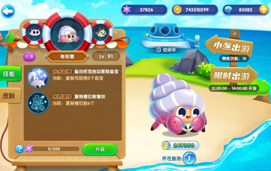 现在总共有四个宠物,分别是金钱龟(每天三百次,每次可以获得金币,有几率金币变成一个钻石,初始宠物)、水精灵(增加百分比观赏度,V4可得)、寄居蟹(复制鱼宝,12元专属礼包可得)。海兔,海兔通过摇蛋机里面金币抽奖来换取20个碧玉突破石来换取,每天十次出游机会,出游可以获得海洋之心、绿晶突破石和宝箱。海洋之心可以提高宠物等级,宠物等级提高可以增加观赏度,宠物每十级可以用绿晶突破石突破一次(水精灵需要用