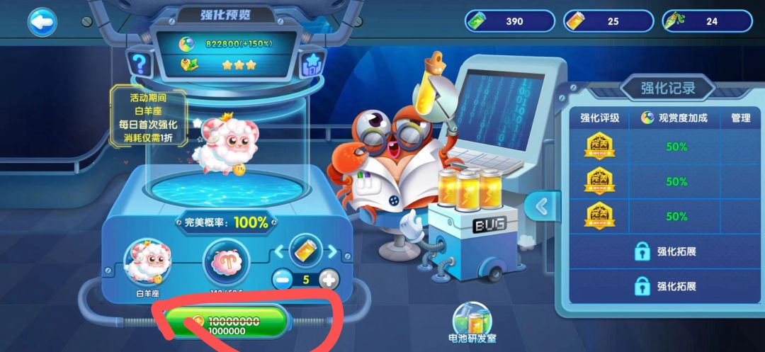关于新手强化科普常识和诀窍。 此游戏一个月四个星期分为强化周和变异周,相互轮换交替。 1:变异周的周六周日所有萌鱼变异概率双倍。 强化周的周一到周日都属于强化周。 2:强化粥分为两种1:首次强化消耗减半。2:强化概率增加百分之五十。 3:电池分为黄电池和绿电池。黄电池比较稀有,只用于强化活动类SSS萌鱼和扭蛋的SSS。 所有可以用鱼兑换的萌鱼全部用绿电池去强化。50个55%的概率。 4:觉醒之石。