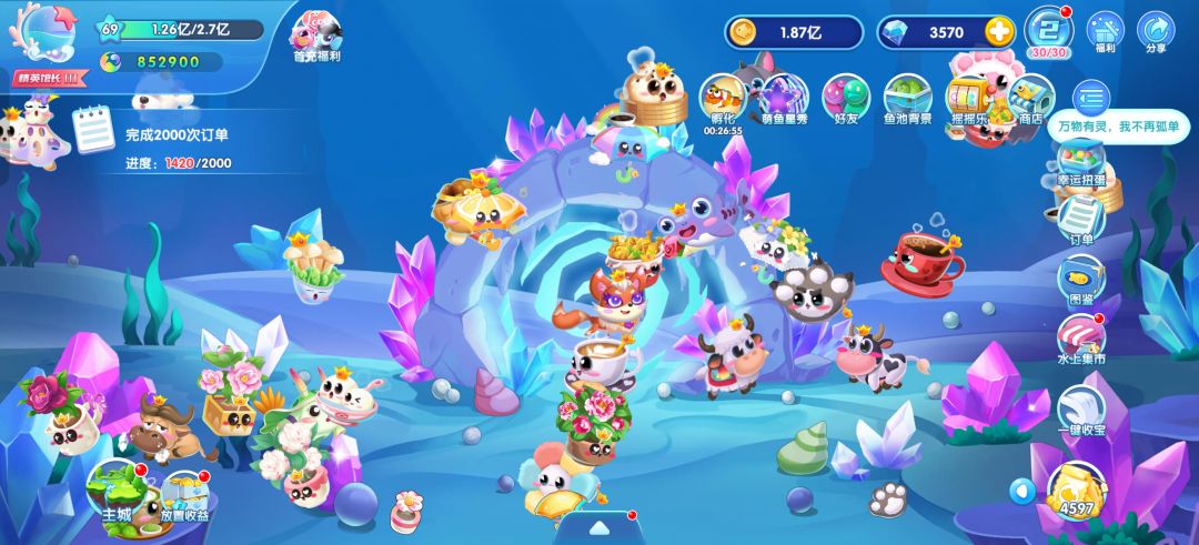 1、加个鱼乐圈找个大腿抱。 2、每日任务做完拿到碎片还有一次抽奖券(不要想着不弄因为sss鱼需要它的鱼宝)。 3、每日12点到2点限时出游最后5分钟左右用钻石(13:59分用最好前提有人上4人组队车,因为1分钟就是5钻石) 4、游乐场第一个(合成马卡龙)可以不用弄退出去就有一个礼包了又不浪费时间,后面两个可以认真弄。 5、金币不够可以在离线收益里面白嫖一次。 6、每日乌龟必须点不充钱每日点乌龟有钻