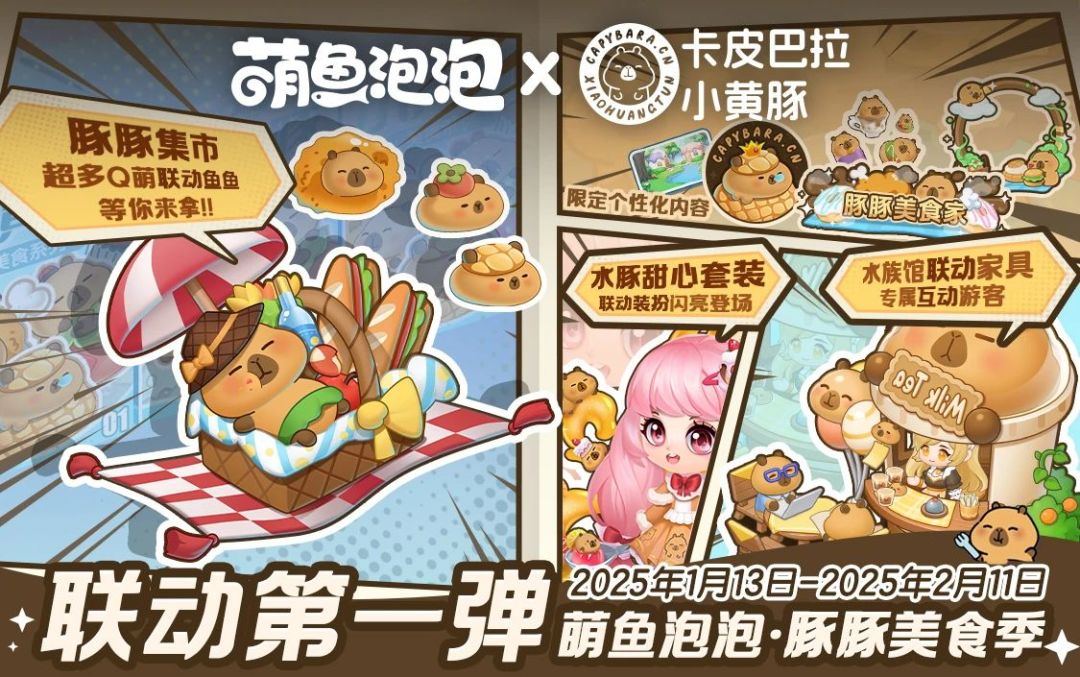 活动总览 1. 豚豚美食季限时上新19种新萌鱼; 2. 活动上新“水豚甜心”“豚门永存”联动装扮; 3. 参与累充得“豚豚甜品森林”鱼池背景; 4. 水族馆上新游客“甸鸢”及专属互动家具“豚豚奶茶小铺”; 5. 萌鱼泡泡 X 卡皮巴拉 活动直播。 报!!远处海岛发现一处豚豚美食集市~准备好迎接一场前所未有的联动萌鱼盛宴!新图鉴、新背景、新装扮、新游客...不仅美味满分,收获也能满满当当~活动限时!