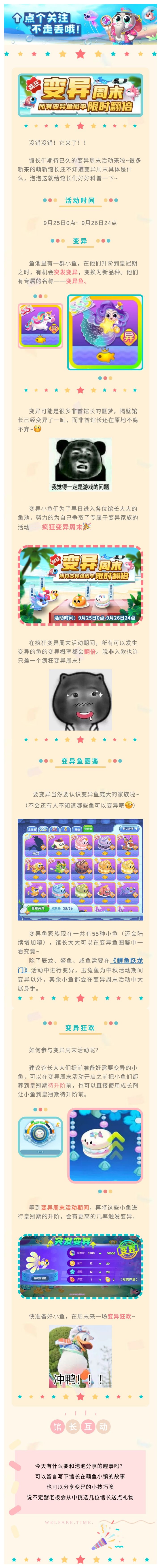萌鱼大佬们看过来啦!萌鱼泡泡游戏自上架到现在,泡泡经常会看到有大佬们在论坛里发布各种玩法收集攻略,也有部分萌新馆长对玩法还略带疑惑,所以这次泡泡特地准备好了游戏福利,向馆长们征集萌鱼泡泡2.0攻略!活动详情请往下看~👇本次征集共分为6个主题板块【水上集市攻略】(玩法逻辑,鱼等级划分,基础鱼,变异,四季集市)【扭蛋机攻略】(日常扭蛋,活动扭蛋,金币扭蛋,扭蛋券)【孵蛋攻略】(孵化屋,获取方式