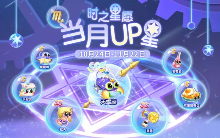 活动总览活动时间:2022年10月24日开启具体上新时间以游戏内更新为准夜空中星星闪闪发光,指引馆长们漫漫收集之路。时之星愿10月24日起当月UP星为【天蝎座】,一起来看看天蝎座及它的星座伴生鱼吧!SSS级天蝎座皇冠期天蝎座观赏值:180000给你两个选择:跟着我干,还是跟我对着干~SS级雕具SS级雕具座雕具变异获得SS级蛇夫SS级蛇夫座蛇夫变异获得S级星星帽S级沙滩帽星星帽