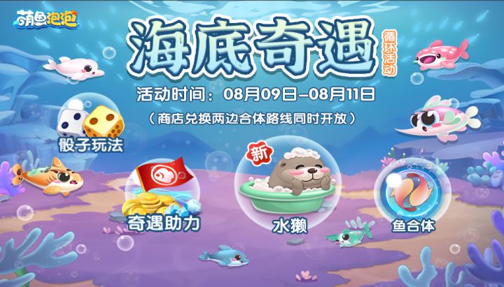 海底小分队快前往集结啦!这次的海底奇遇活动两边萌鱼同时开启哦~还有俏皮十足的新鱼【水獭】加入狂欢队列!活动还没开始泡泡对水獭已经心动一万次!另外,不知道馆长们对海底奇遇的哪只鱼印象最深刻呐?🐟⏰活动时间:2022年8月9日—8月11日