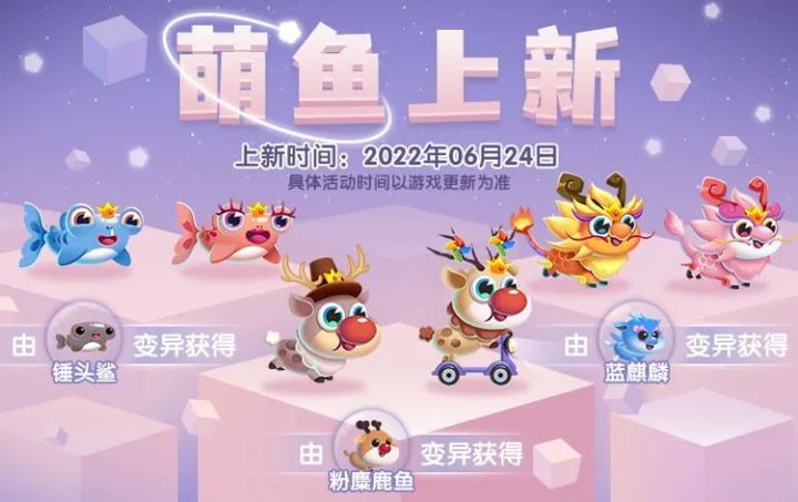 hi~本期活动泡泡又带领新活动前来报道啦!不仅有变异新萌鱼加入,更有全新水上集市大象老板的好感度系统上线,精彩不容错过~三组萌鱼CP组合简直可爱到犯规~带着点呆萌气质蓝锤头鲨、粉锤头鲨,活泼可爱的滑板麋鹿、麋鹿先生和灵气十足的神兽火麒麟、粉麒麟在这个夏天与馆长们相约萌鱼小镇~S级蓝锤头鲨(锤头鲨变异获得)S级粉锤头鲨(锤头鲨变异获得)SS级滑板麋鹿(粉麋鹿鱼变异获得)SS级麋鹿先生(粉麋