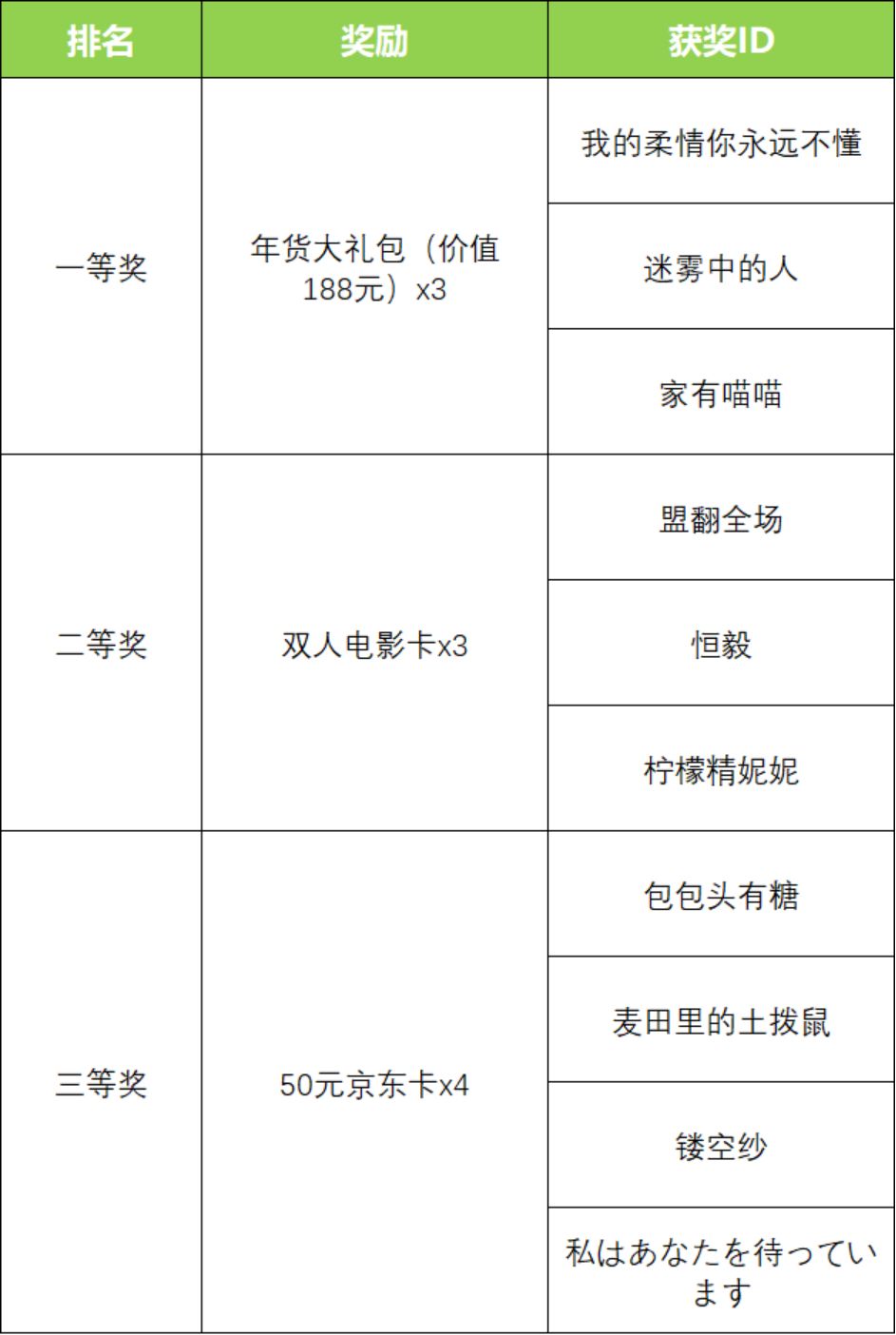 活动到这里就结束啦,感谢主公们的支持~ 接下来我们来公布获奖名单趴~ 恭喜获奖的主公,没有获奖的也不要灰心哦~ 请获奖的主公们在2月8日之前在本贴下方回复领奖信息 ①、领取福利的邮箱: ②、获奖回复楼层截图: 【注:若未在规定时间内回复信息,我们将遗憾视为自动放弃奖品。】 兑奖截止日期后,奖品将会陆续发出,主公耐心等待一下哦~ -----------------------------------