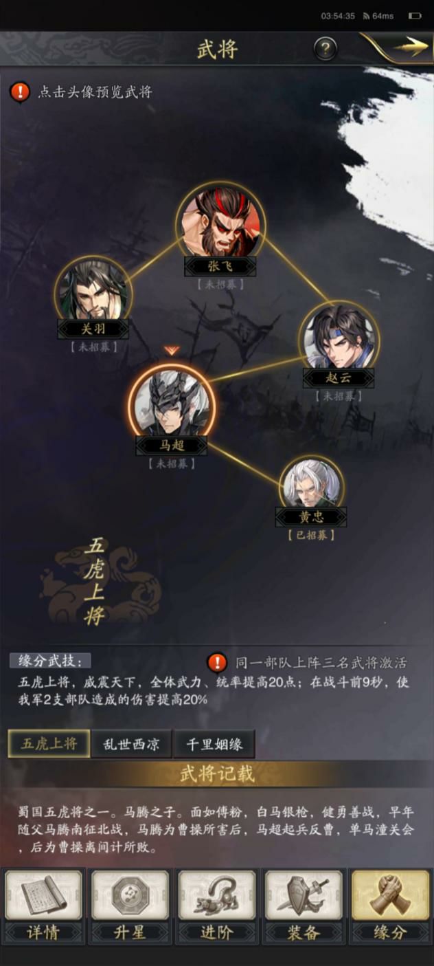 佛系玩家一枚,分享一点自己的经验搭配。考虑到老手们对于如何搭配阵容都有自己的心得。如果你对游戏的理解程度一般,那么建议做以下搭配。 第一种,缘分流 顾名思义,就是根据游戏内提供的武将缘分进行配对,以触发相关的羁绊。最简单也是最无脑的配对方法,按照药方抓药。比如,我有马超,关羽,黄忠等三位武将,可以组成五虎上将的组合。简单粗暴的菜刀buff,也算非常适合这三人的定位了。 这种思路,就是系统安排好,我