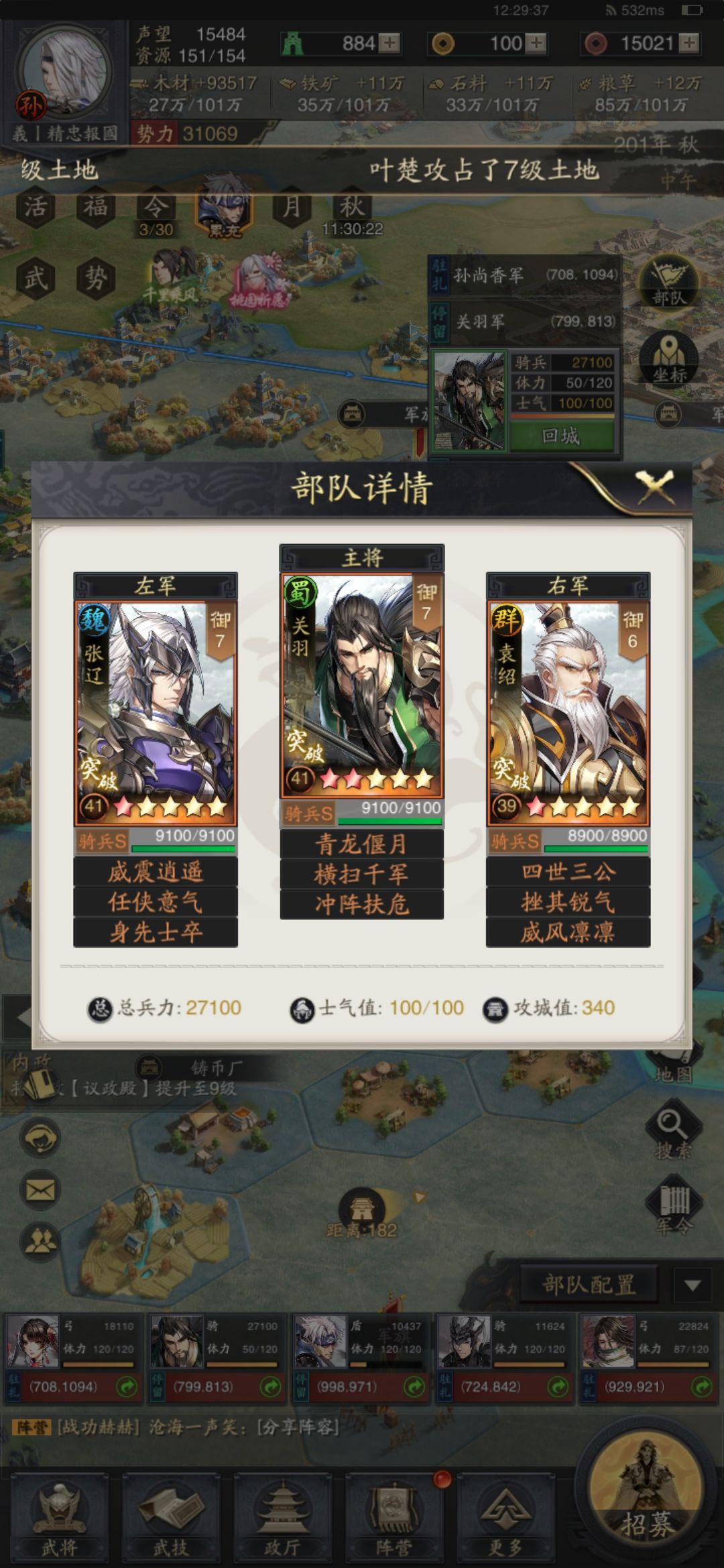 1、前期开荒的核心思想是尽可能的降低战损,尽量不翻车,且能够最大限度的拿下5级地(屯田用,各类只拿一块,否则就是违反了降低战损的前提) 2、多侦查,兵种克制能为部队降低兵损,优先选择主力部队克制、离主城近的资源地开荒 3、武将组合搭配治疗型武将,部队打地兵损下降,避免翻车(战败) 4、当然翻车也莫慌,新手期80%资源返还,而且这游戏前期有领土保护,在自己主城周围内的土地是不会被其他人抢的,保持良好