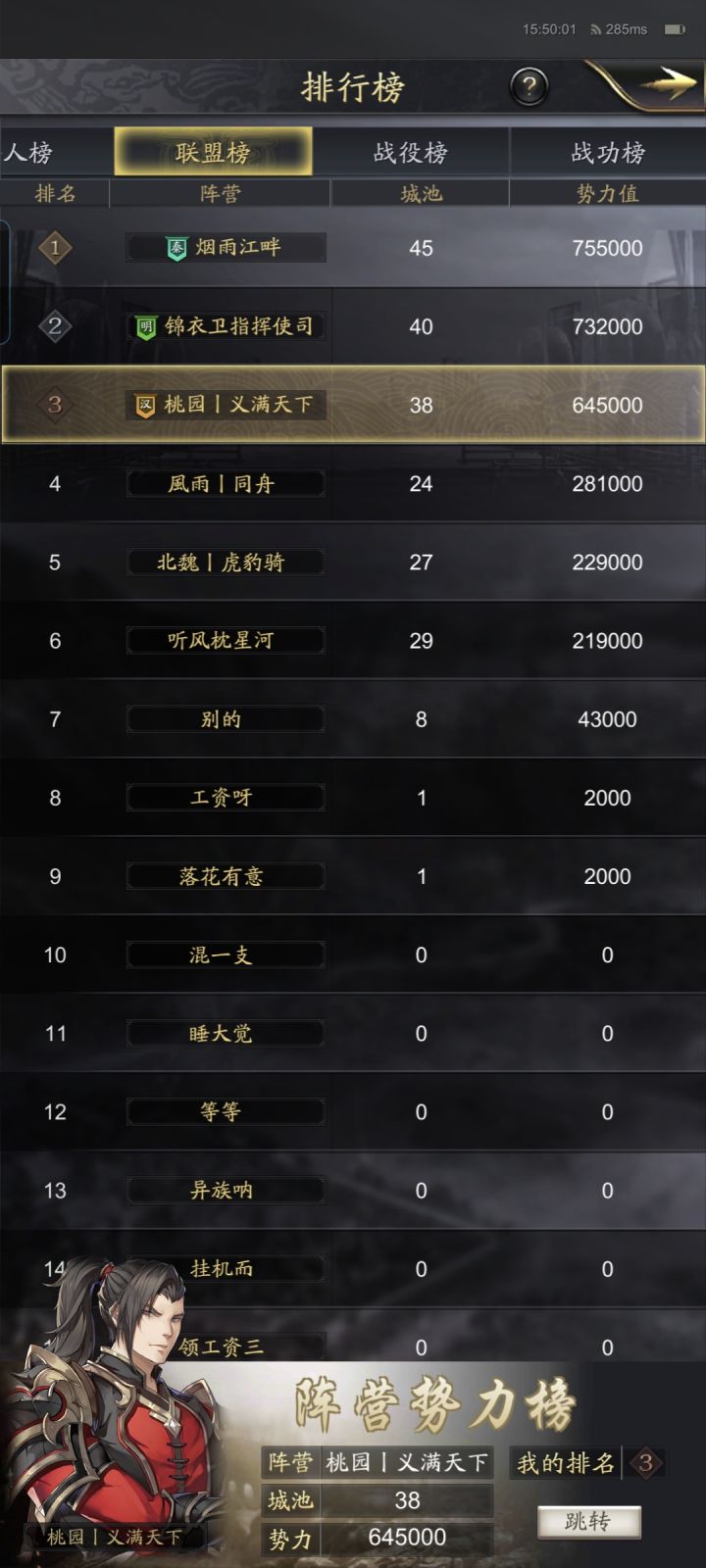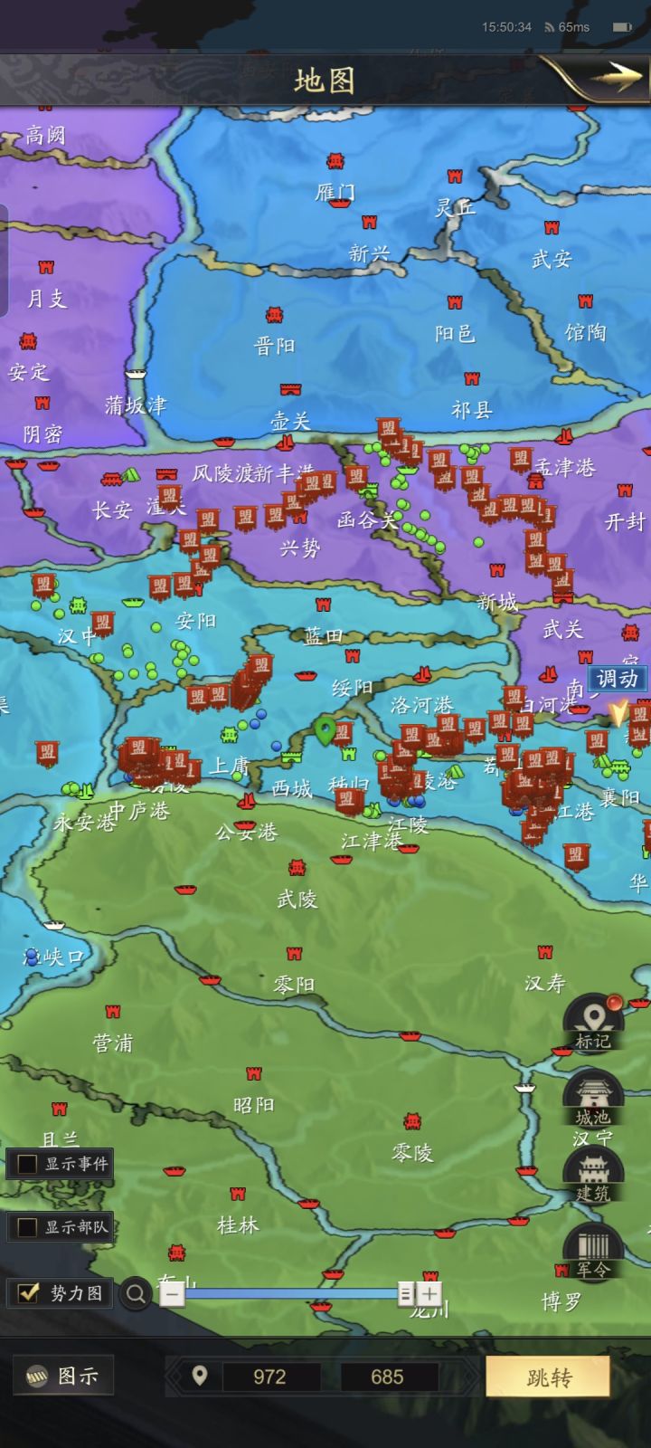 前几天,吕布(风雨)守住汝南后,出砀山,向曹操(锦衣卫)阳城进攻,逐步在阳城右上交山脚边站住了,建起了3级要塞,双方僵持了一天多,阳城被打掉了一些城皮,但风雨最终没有拿下阳城,后就撤守汝南这边。这几天大家都是在刷战功。孙权(听风)和刘备(虎豹骑)在江夏刷。马腾(烟雨)和刘璋(桃园)在息县刷,吕布也在息县。另外曹操和吕布在汝南上渡口互相拉扯,也当做是刷战功估计。下面看下总体势力排名和势力图。