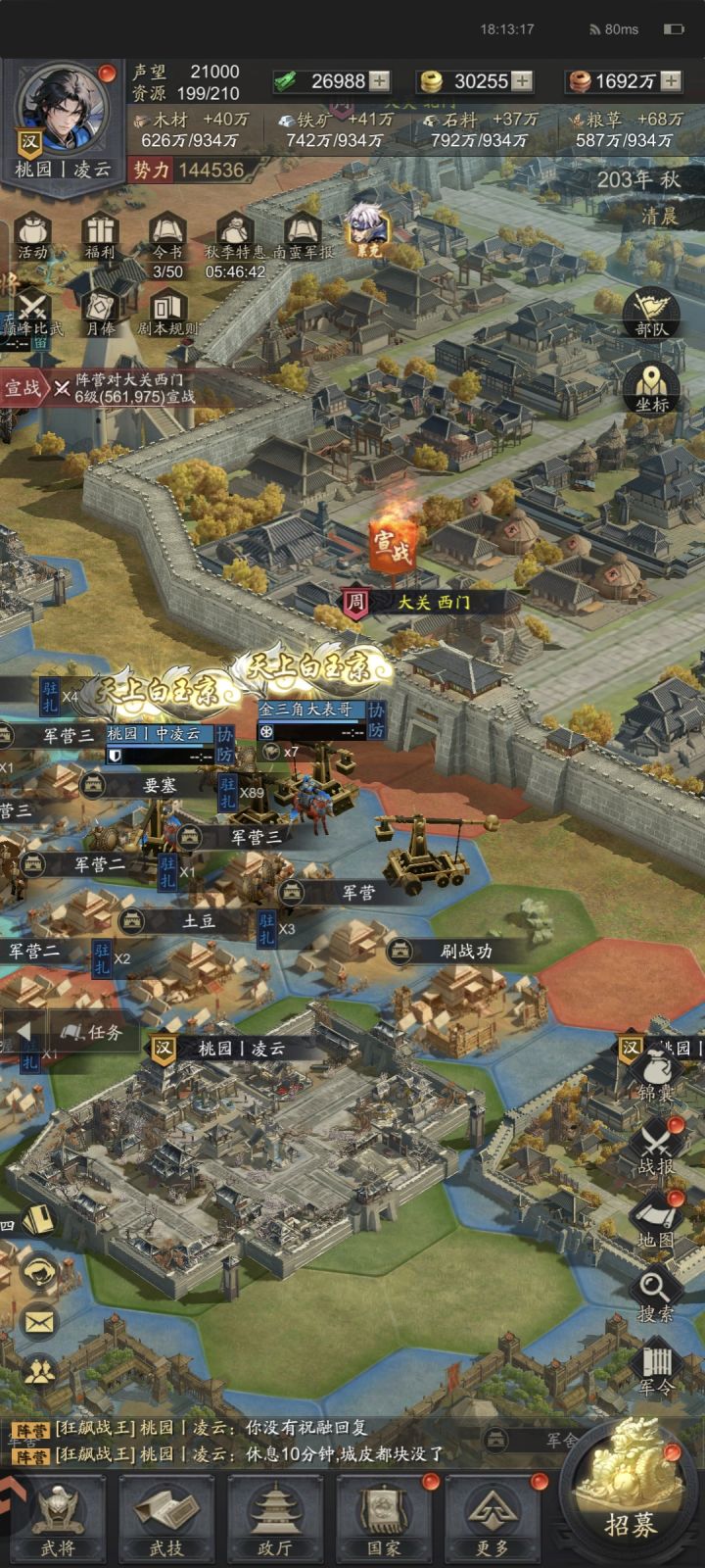 这段时间还是在大关刷战功,抓孟获次数我们达到3次,再抓一次就达到了霸业次数了,对面3次。听说明天有活动,想抽下神兵。