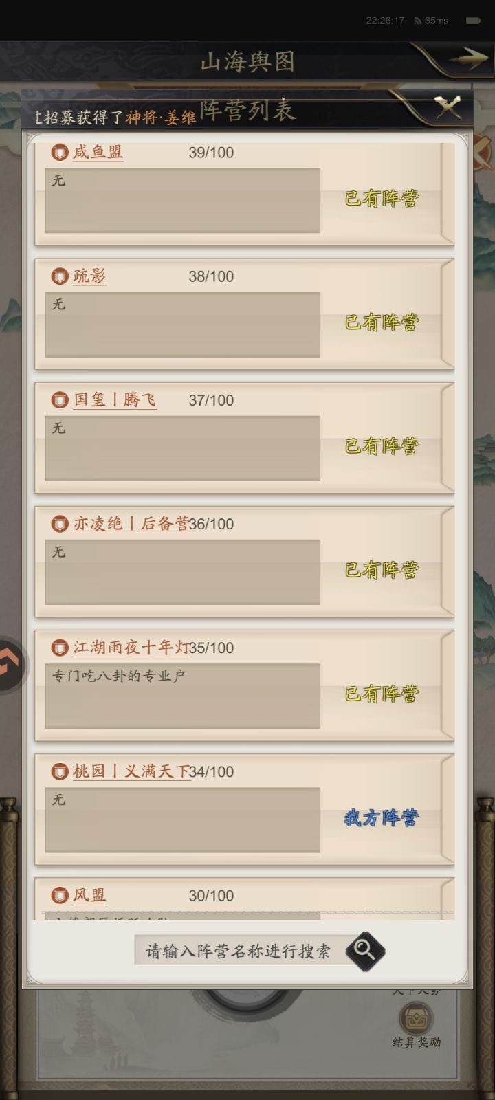 七擒孟获已结算,新的剧本六雄纷争开始报名了。六雄剧本,如果是副本一区的话,哪战斗是相当激烈,之前玩过很多次。六方势力,刘璋势力是最厉害的,其他势力各有特点,孙权、刘备、吕布、马腾势力特性也可以。这次报名满号盟不少,出现了不少厉害的新盟,例如扶摇、虎啸、锦衣卫、其他很多盟不太熟悉,我们桃园这次准备混郊区,有34个号进本。期待能分到刘璋势力。祝我们好运吧!