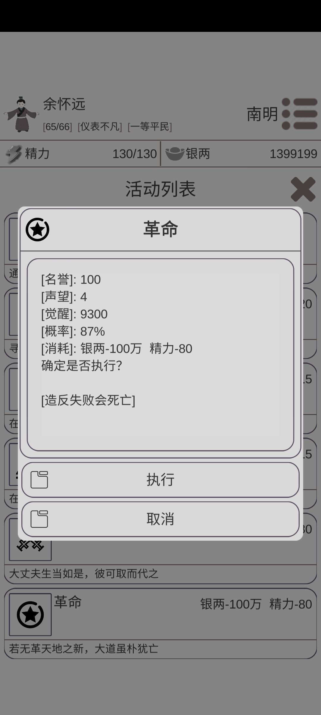 一品大员护驾! 只讲思路,仅供参考。 楼主300空间币贵族出身, 开局孝顺父母名誉拉满100点 接下来处世点到160 16岁活动内刷新出游历,游历搞到200万,造反概率百分之六十 精力还有30点不够造反,不能浪费,反手点开宫廷开放海禁影响稳定。 不犹豫直接下一年,开放海禁降低了100稳定,成功率上升到百分之六十二。不墨迹直接造反,剩下的交给天意。 17岁造反成功,称号红眉!