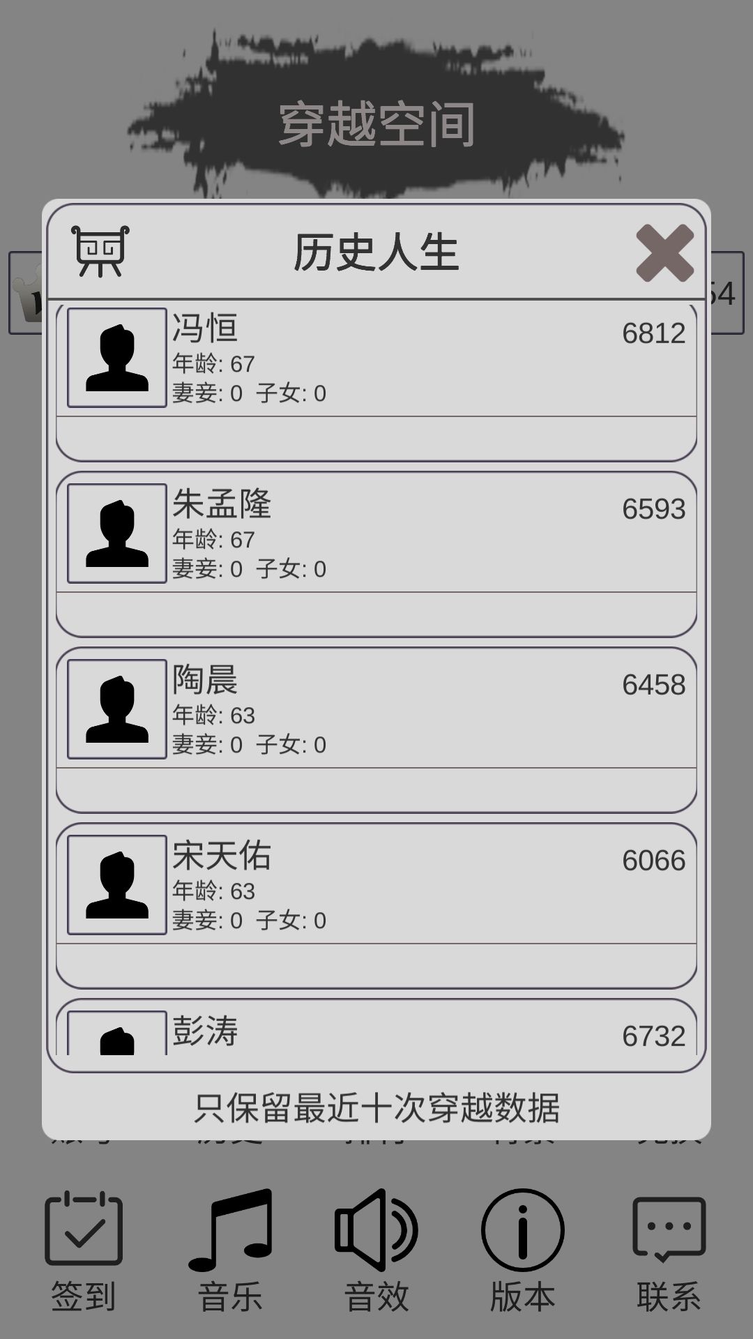 肝四个小时,终于玩出了一个套路。附上图片与攻略 1这是平民开局也可以做到的六千多分 首先你需要 按家族 然后按你的父母 最后点击孝敬 然后把名誉涨到100 你孝敬父母是有几率加名誉 2 接下来等到有工作的界面,按走私(为了攒钱,虽然有几率被抓,但是获得的钱基本上都八九十两,用这些钱把处世能力学到200满,中间钱不够的话,求走私赚钱 3 处世200之后,就在 工作当管事,一有一百两就去游历,一直有