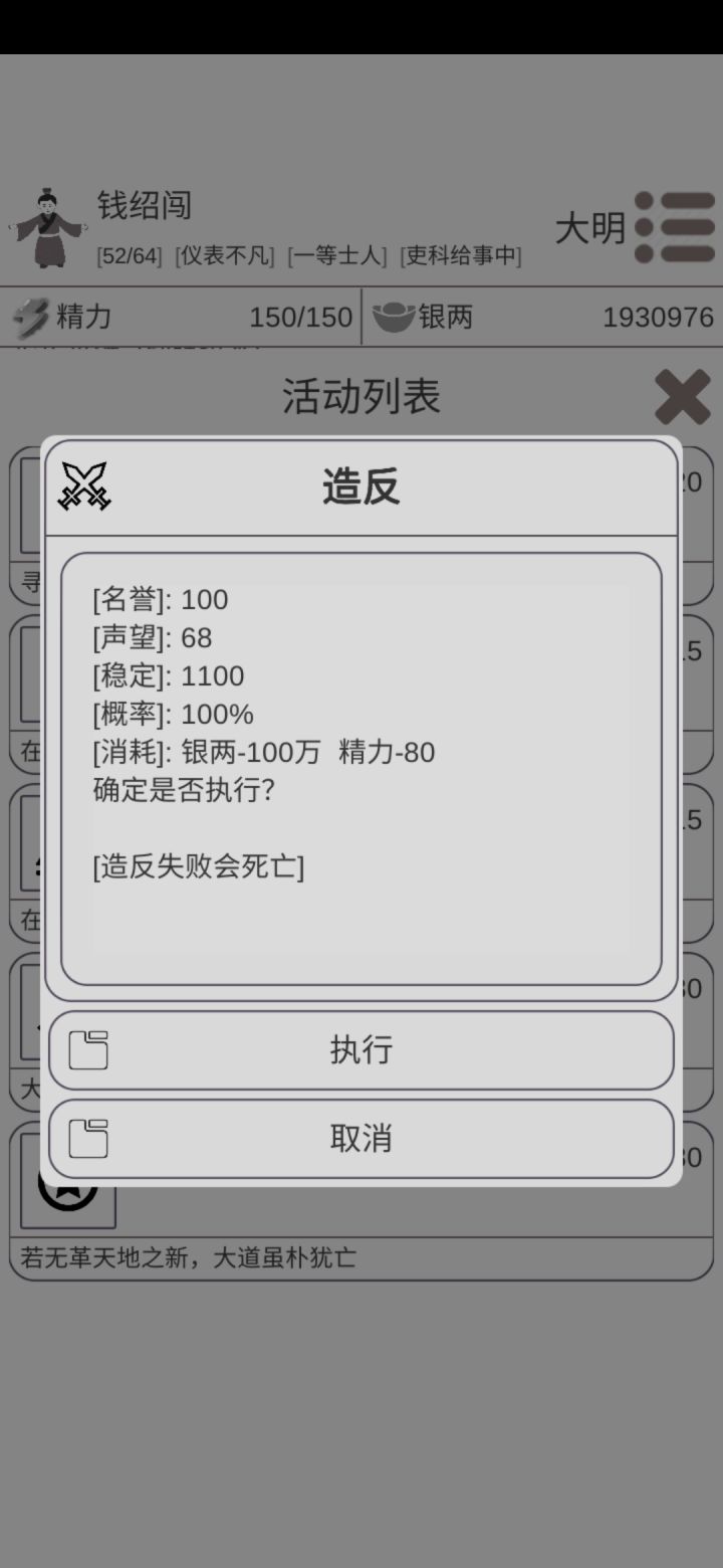 造反:需要破坏稳定!开海禁后学航海,航海满则100%成功!(注:当时间为明末时会有清兵入关!朝代变化为大明→南明→大清造反绝对失败!)