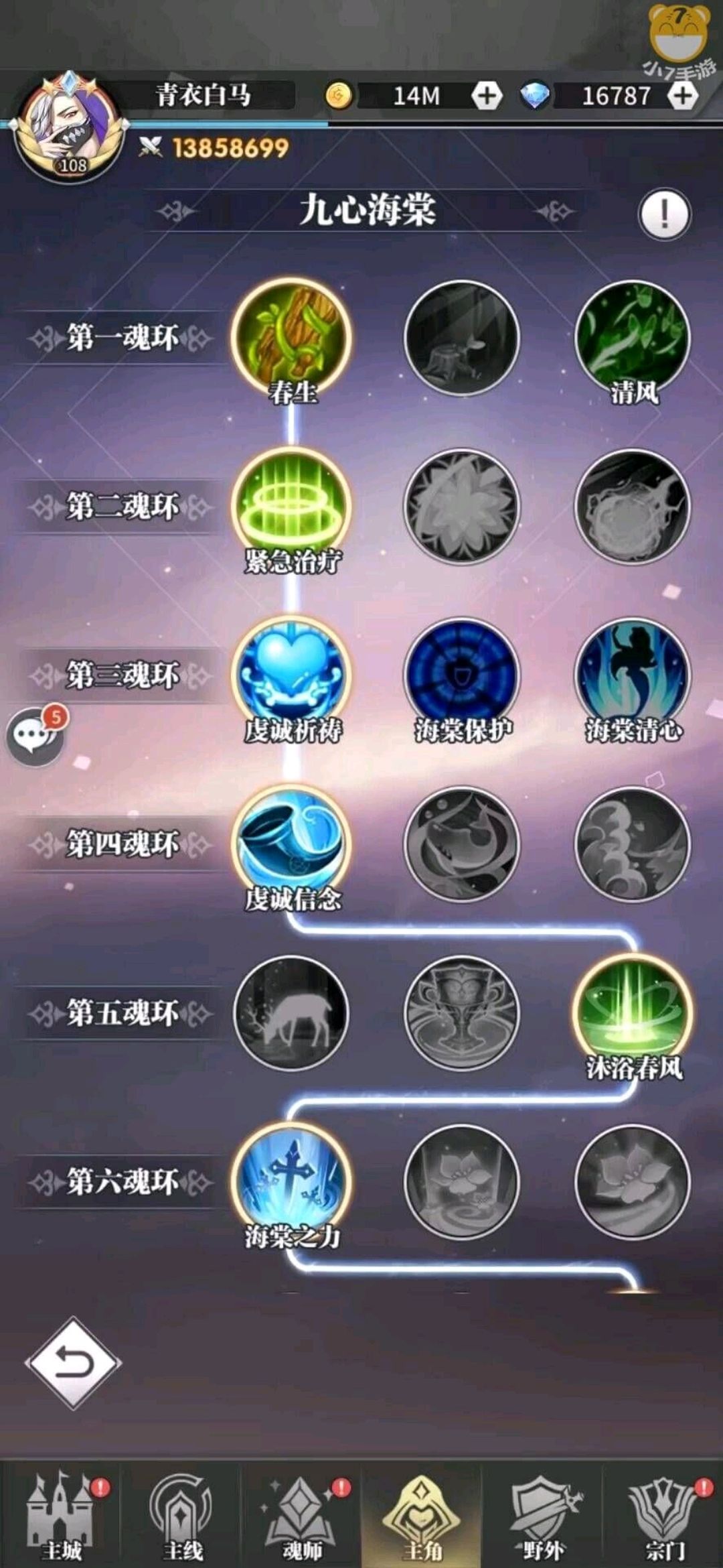 玩的不久,将经验总结一下,新手可以少踩坑。 1,魂师 因为前期抽魂师很看脸,所以别在意魂师,搭配问题。不然要的魂师不来,就很尴尬。 所以前期只专养一个魂师,输出用,首推海三/千任雪(强推版本之子-海三)。主要目的是从日常任务中时间裂隙、试炼、杀戮、落日森林、积分赛,刷更多的资源。选好之后,把所有许愿屋、先知召唤主修一个系。比如选了海三,那就所有抽镜灵的机会都尽可能的是水系。千任雪就火系。 其他再选