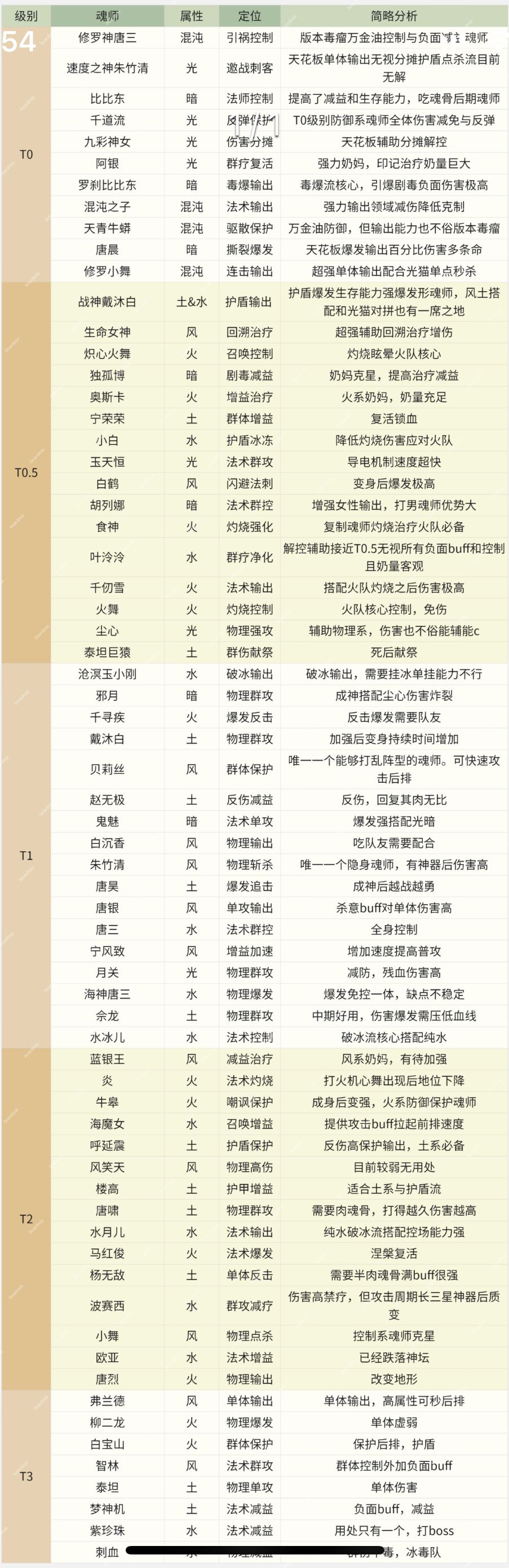 作者:游侠 T0: 阿银:光、辅助,最强的复活奶妈,光系可以随意搭配。 尘心:光、强攻,最强的单体输出。 邪月:暗、强攻,可以针对敌方后排输出,超高的撕裂伤害。 T1: 胡列娜:暗、控制,附加迷乱、大招可以减疗 小舞:风、敏攻,控制点杀、技能提升质变 宁风致:风、辅助,提高输出、加速免伤 朱竹清:风、敏攻,撕裂斩杀、击杀追加 马红俊:火、强攻,爆发灼烧、加攻加暴、高额群伤 火舞:火、控制,灼烧减益