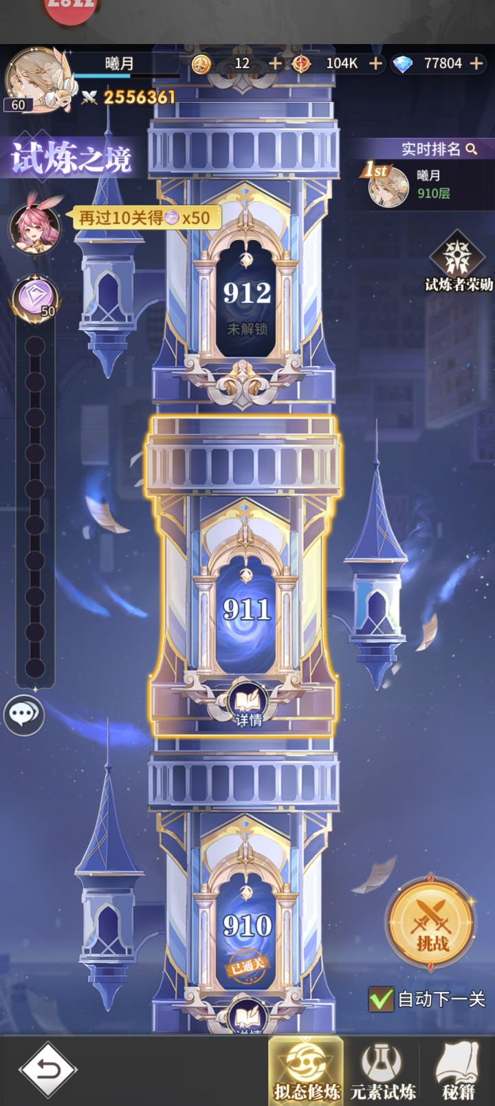 第二个六天来啦,对比上一个开了武魂真身的第六天进步明显目前战力256w,爬塔910层,今天出小店活动花了不少钻石现在还剩7.7w今天狗运出了俩心愿,配合自选直接把蛇龙和唐月华拉到了彩二,倒是没想到缺狗粮了,不然马红俊还能彩一提点战力新活动感觉挺夯的呀,现在已经合出来一片索引了,不知道第一件要补哪个神魂,希望能配合新服三十一天的神魂活动拿下一个本体上一个就是玩到开魂导器就转生了,今天大致看了