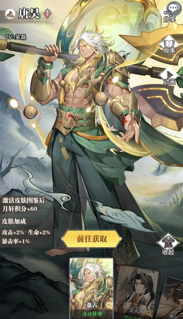 新皮肤 一、神躯利斧 斩尽束缚“一元初始,斩分阴阳;万象皆新,快哉我意!”祂诞生于原初混沌,万古蒙昧的长夜中,祂以身为利斧,以意志为明灯,斩分阴阳,混沌散尽。此后千万年,人间欣欣向荣,万物生发有序。祂行走于自己创造的凡世,仰天而笑,且行且歌。获取方式:维序者们可前往限时活动页面抽取皮肤,激活皮肤后,可获得唐昊「盘古」皮肤专属头像和专属形象。 二、新款魂导器上线楼高工坊诚意出品,新款魂