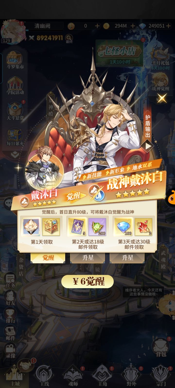 第二个六天来啦,对比上一个开了武魂真身的第六天进步明显目前战力256w,爬塔910层,今天出小店活动花了不少钻石现在还剩7.7w今天狗运出了俩心愿,配合自选直接把蛇龙和唐月华拉到了彩二,倒是没想到缺狗粮了,不然马红俊还能彩一提点战力新活动感觉挺夯的呀,现在已经合出来一片索引了,不知道第一件要补哪个神魂,希望能配合新服三十一天的神魂活动拿下一个本体上一个就是玩到开魂导器就转生了,今天大致看了