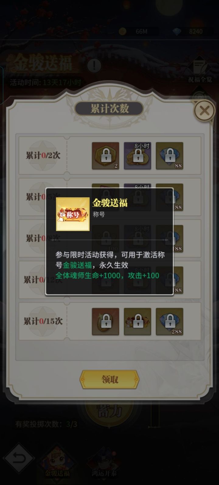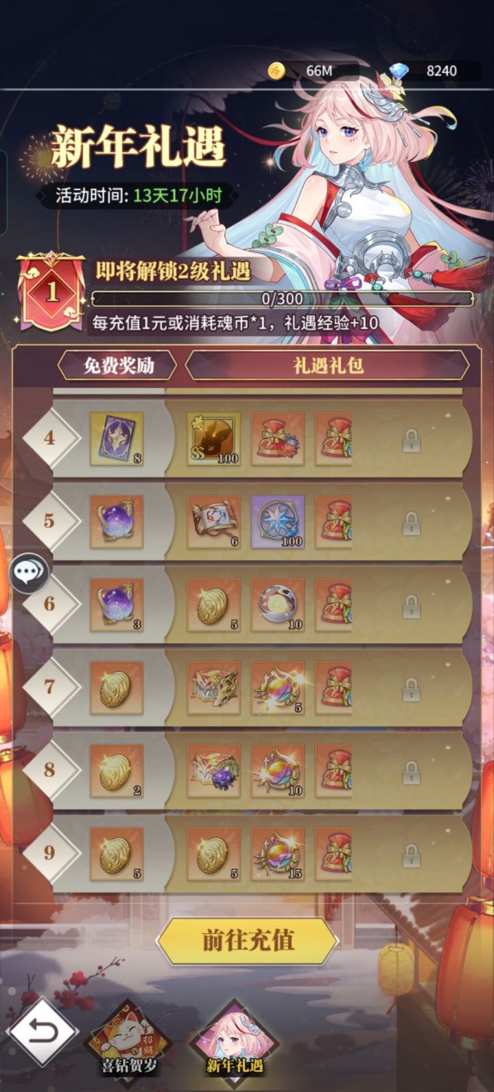 第二个六天来啦,对比上一个开了武魂真身的第六天进步明显目前战力256w,爬塔910层,今天出小店活动花了不少钻石现在还剩7.7w今天狗运出了俩心愿,配合自选直接把蛇龙和唐月华拉到了彩二,倒是没想到缺狗粮了,不然马红俊还能彩一提点战力新活动感觉挺夯的呀,现在已经合出来一片索引了,不知道第一件要补哪个神魂,希望能配合新服三十一天的神魂活动拿下一个本体上一个就是玩到开魂导器就转生了,今天大致看了