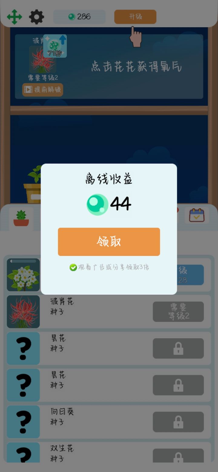 进去的时候有广告,有阳光进入画面的时候点有广告,看完广告后返回游戏还是广告,对于有强迫症的在商城那看广告得红钻那里肯定会再点,又是一次广告了。如果是对于想要快点解锁完花种的就要重复以上的循环,升级的速度也还可以,没有那么慢,就是我没弄懂在哪拿的经营,除了升级花种外就不知道了。