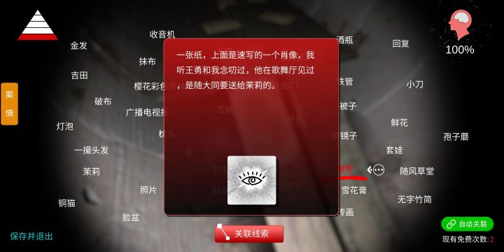 温馨提示:游戏中有大量线索都需要查看物品详细情况,切记,我就因为忘记忘记查看而丢了一条线索——目录:1.线索图鉴2.关联公式3.重要线索————一、线索图鉴————二、关联公式1.其他人:金发,樱花彩色菲林,球鞋2.林淑秦:其他人,存折3.一个方法:纱布,Apc,缝合针,外科手术,林淑秦4.真相:神兽1,神兽2,怪石1,怪石2,一个方法,林咏欣,长命锁,5.凤凰盒子