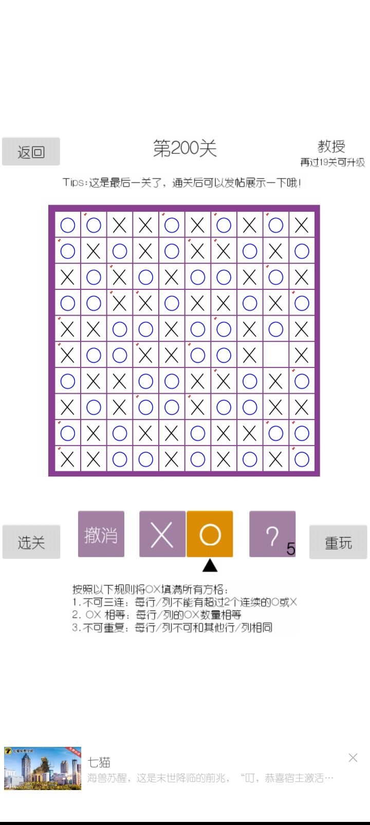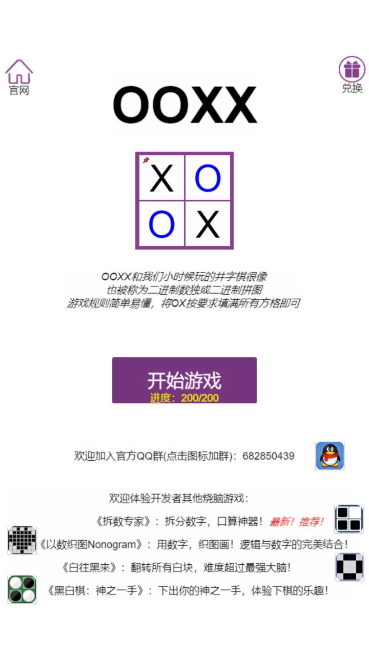 紧急通知:已经下载1.5或1.6版的小伙伴们请尽快更新至1.7版!1.5和1.6版有2关配置错误有多解,感谢热心用户“你好,再见”和"超耐热(Plus)"的指正!--------------------------分隔线----------------------------------大家好,牛年(Year of the OX)最适合玩的游戏《OOXX》更新了!这次更新到200关,已经通