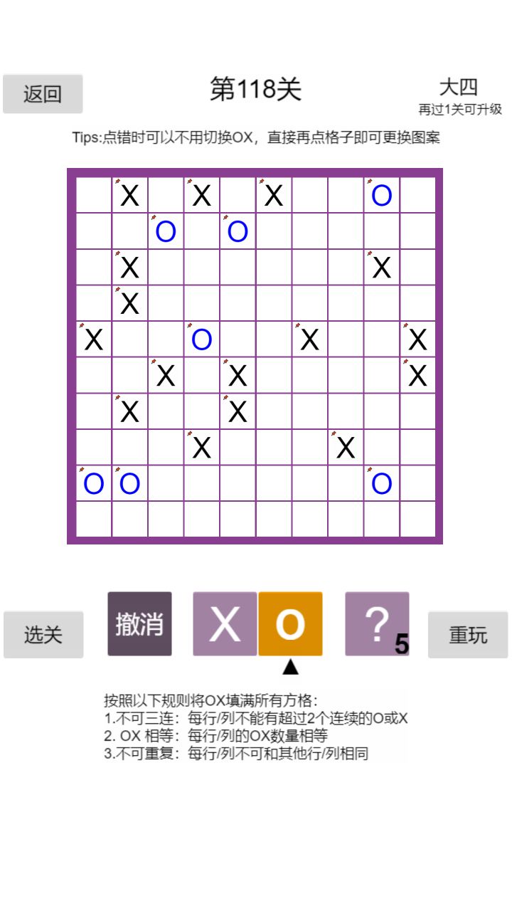 一个人玩的井字棋加强版OOXX已上线!益智烧脑!欢迎来玩!OOXX和我们小时候玩的井字棋很像,也被称为二进制数独或二进制拼图。游戏规则简单易懂,将OX按要求填满所有方格即可: 1.不可三连:每行/列不能有超过2个连续的O或X2.OX相等:每行/列的OX数量相等3.不可重复:每行/列不可和其他行/列相同下面放一些游戏截图先睹为快,喜欢的话别忘了给个好评,另外也欢迎大家来玩我的