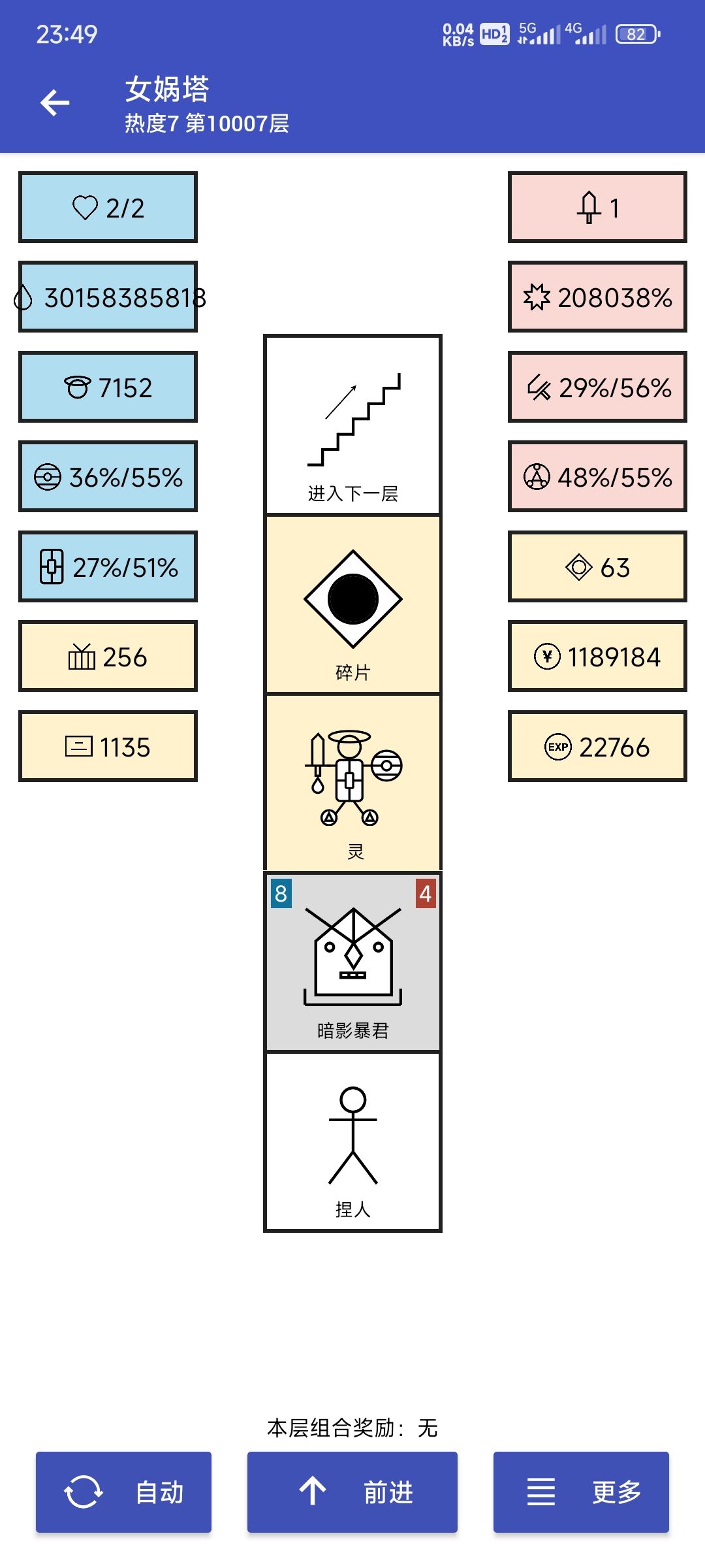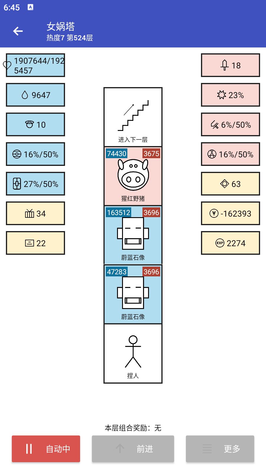 #女娲捏人 数据到1e21 就不显示了。 方法还是基于我之前说的刷生命理论。 主线刷到850层刷不动了。 支线一般能到5000层,理论计算如果是传说商店+6%,应该轻松到7000层。但后面会越来越慢,且慢慢死亡(复活慢慢减少)。 后来想到后期生命核心本来就是商店+3%,所以利用存档不停刷商店。5000开始刷到5500(中间也不是每层都是商店。)电脑自动点击工具+自写python脚本。刷了两天。生