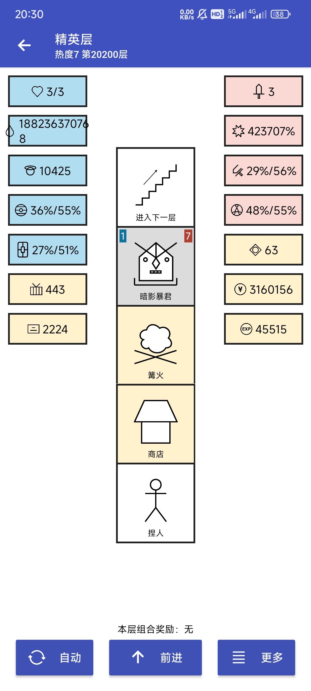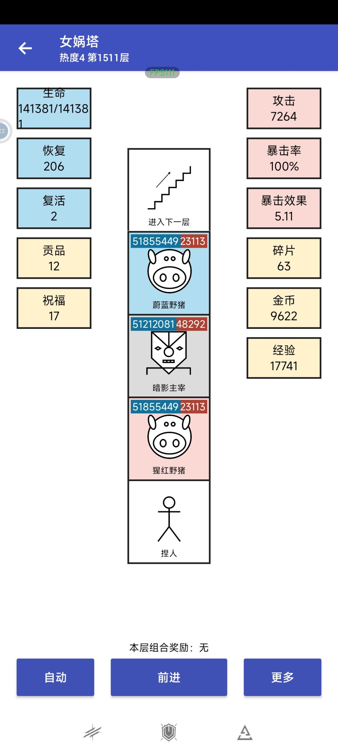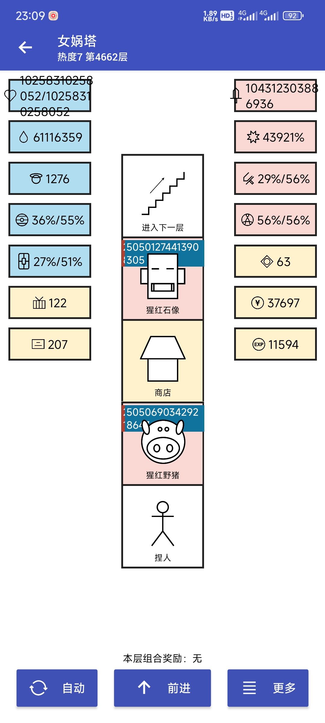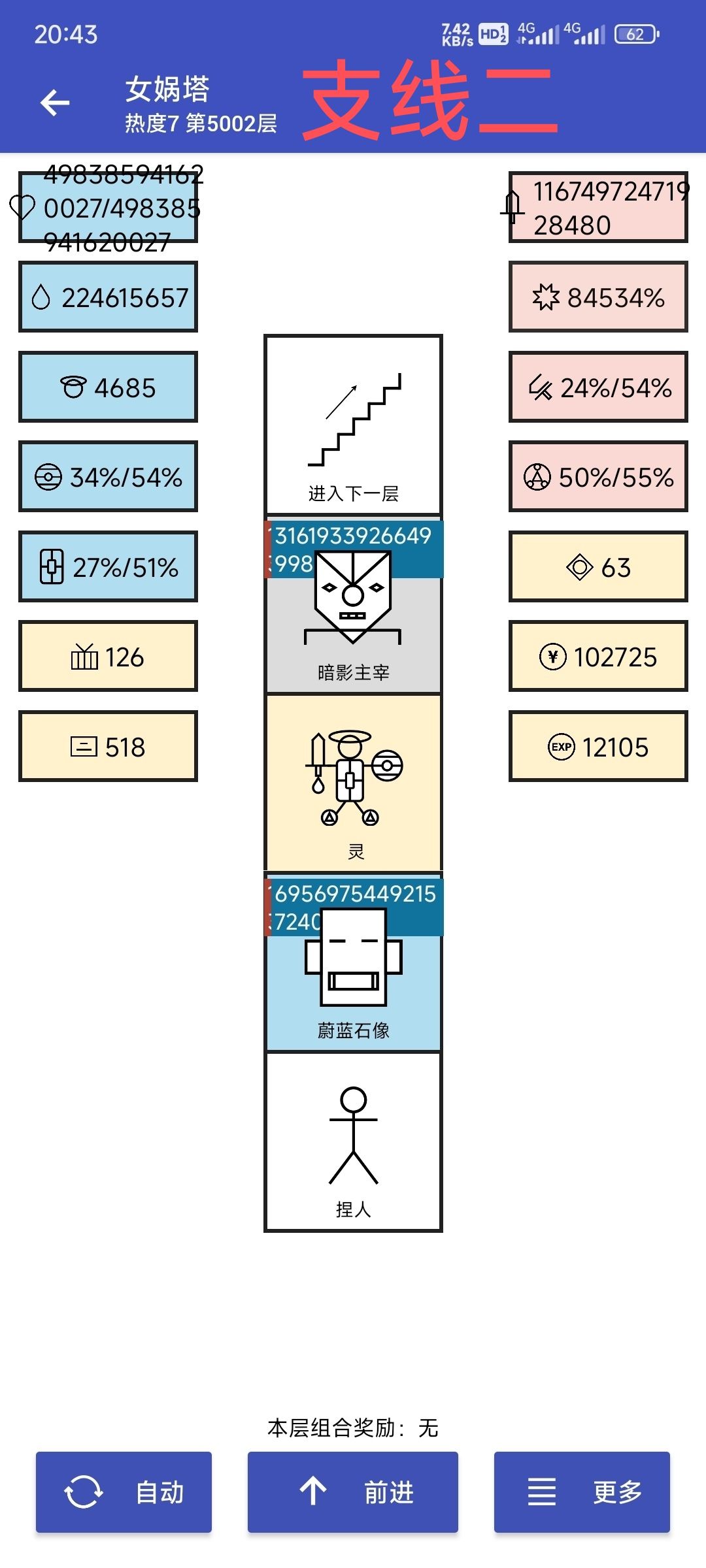 刷生命也刷了半个月了。看看实际效果。 主线: 具体思路看主页置顶。24小时挂着。 744层,2200w生命。刷不动了,看到那只100w生命的蔚蓝石像怪没,要刷2小时左右(我目前最快)。 就这样吧。等哪位有闲有兴趣之士可以继续旅程。 1148bee772d3 支线一: 680层 30W金币开刷的。4200开始暴毙,4500有点吃力,极限估计5200左右。 48238a6e611f 支线二: 730