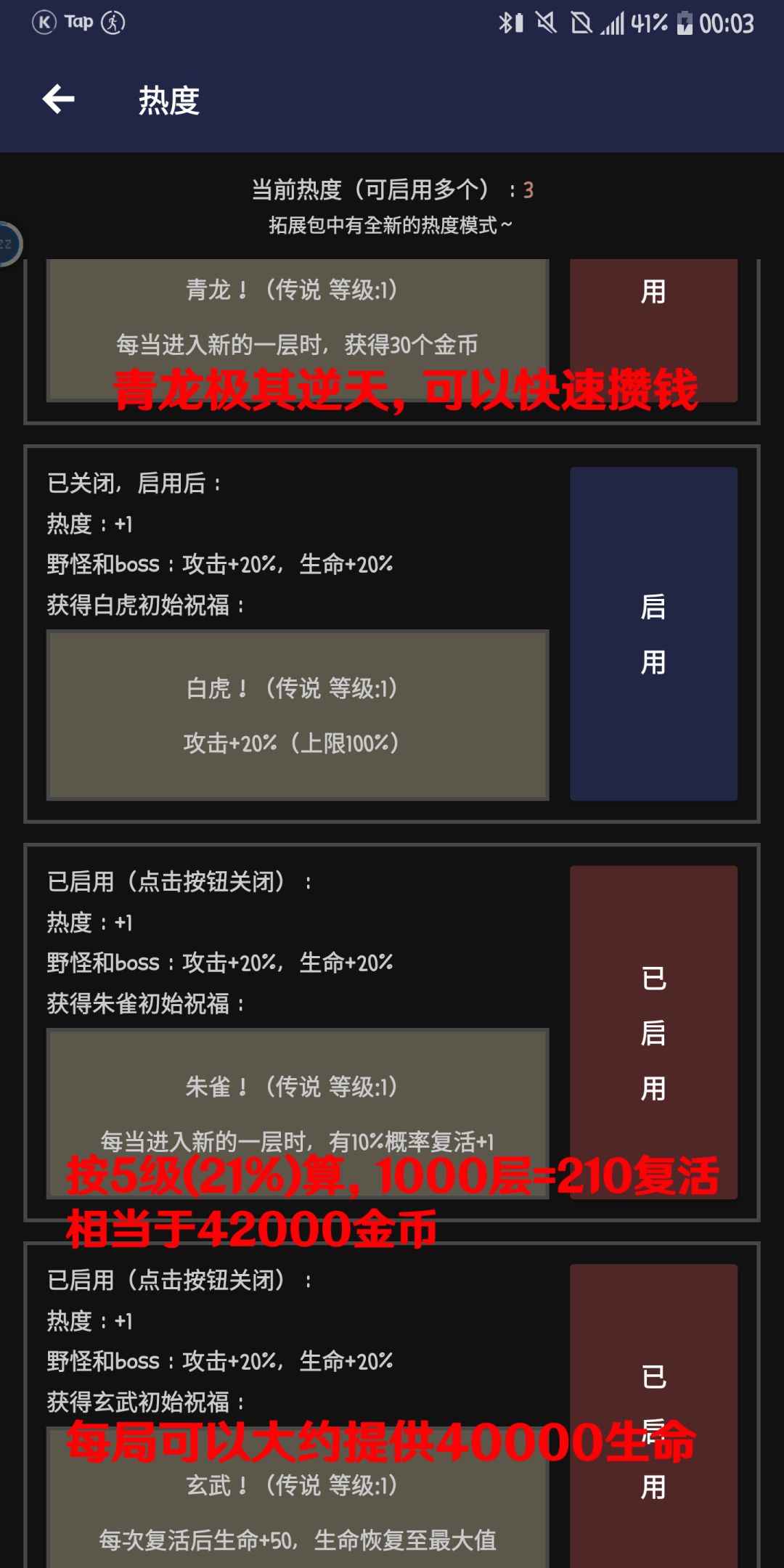 无限女娲塔推荐8热度,祝福尽量选有成长性的那二十多个,因为好像删不了前期选的固定数值的祝福,所以不是性命攸关的关头不必浪费祝福槽位。后期商店里就叠起来了,而且时不时还有三个一样的怪给你加各种数值。 商店,因为有青龙热度是每进一层加30块钱,所以优先点生命,恢复,后期再点攻击,暴击,爆伤。篝火也点第三个加血量,因为有朱雀和玄武热度不必担心死了。 祝福: 被打时叠闪避,免伤,减伤。秒杀。 攻击时叠攻击