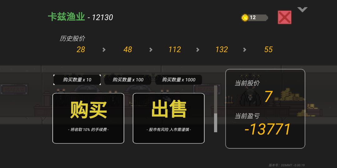 关于炒股的一些想法 我摸索了近两天。发现了个规律。先谈谈历史股价是什么意思?历史股价是以前拍卖的价格。第一次28,第二次,48,第三次,112,第四次132。第五次,55。然后就是第六次当前股价。七股。然后根据你自己的想法平均值来判断。以低价格买入高价格出售。然后就是购买数量。有十股,100股,1000股。按当前价格来说,十股就要70金币,100股就要700。然后绿色字的是股市的名称。负多少就是你