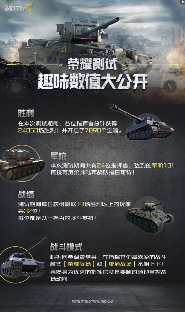 各位亲爱的指挥官:感谢大家参与《钢铁力量2》此前的荣耀测试!在测试结束的这一周时间内,我们仔细的阅读了各位指挥官们给我们的留言和建议,并且制定了一系列的优化方案,将会在之后继续加班加点努力在下一次测试时展现给各位指挥官!另外,我们也整理了一些本次测试的趣味数值,欢迎各位指挥官大大们一起来查看哦~